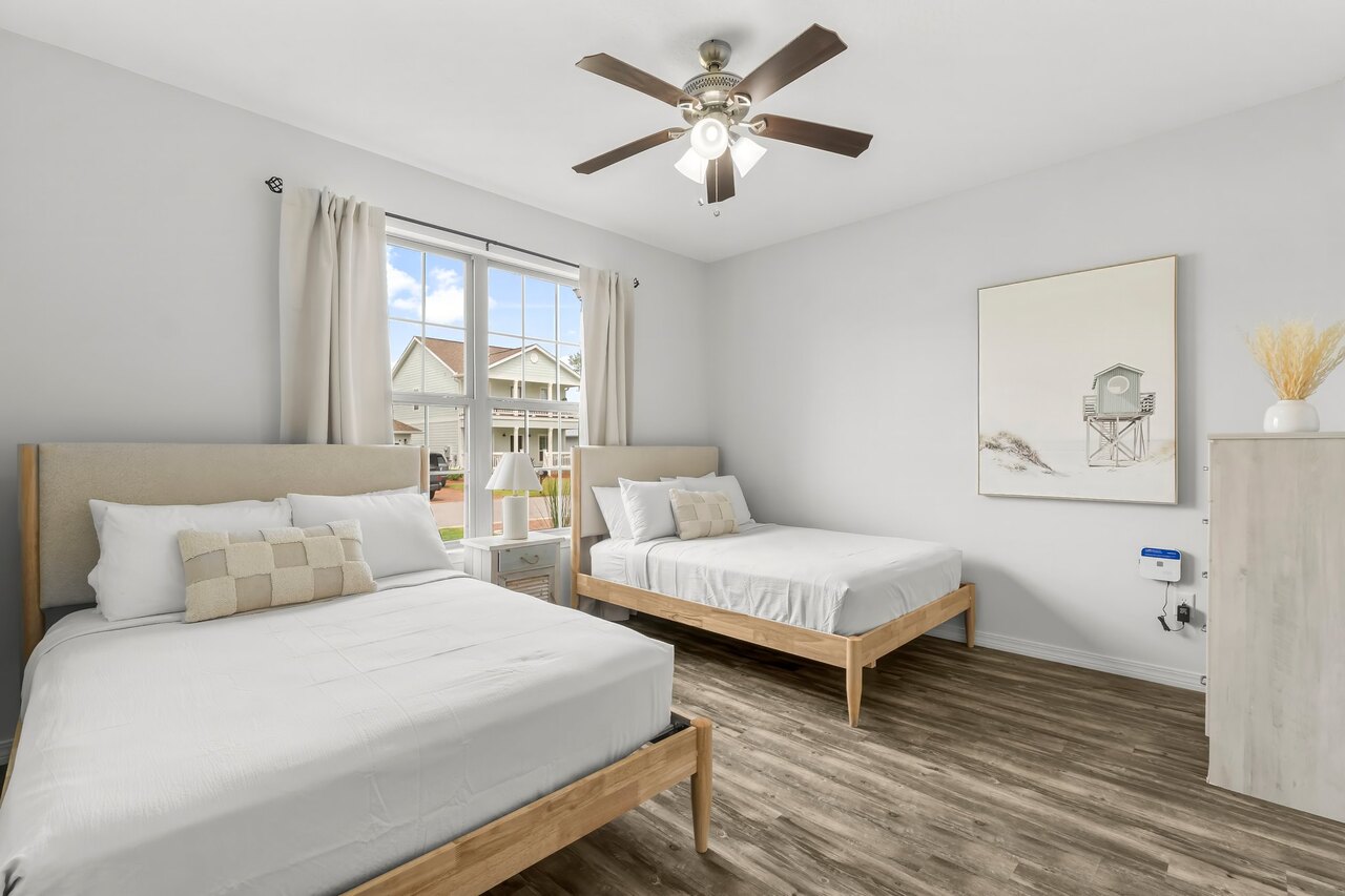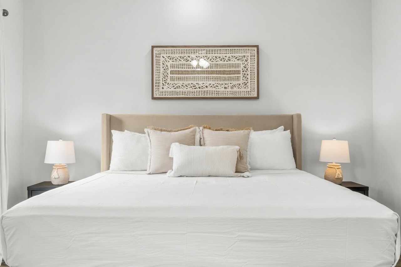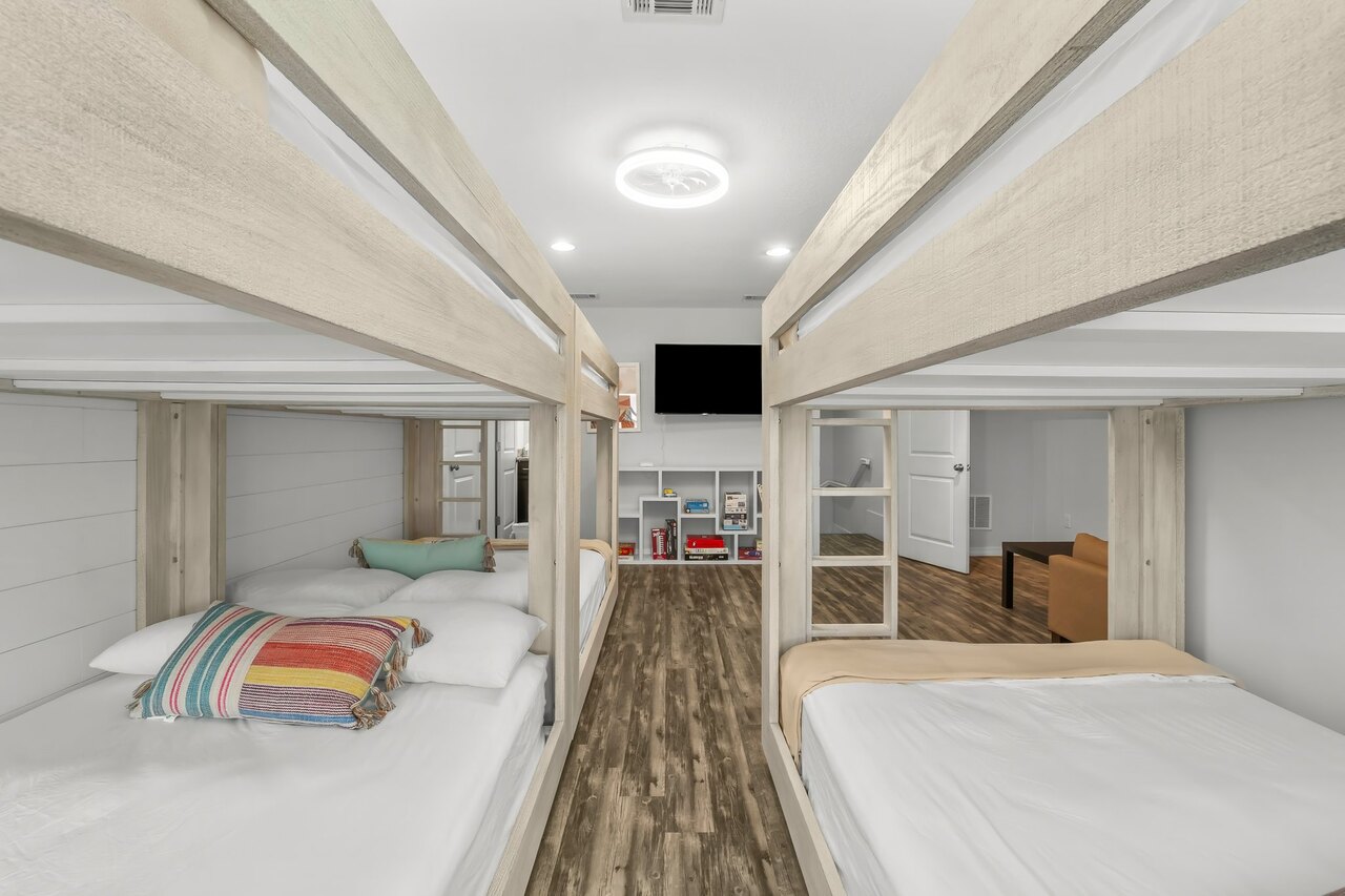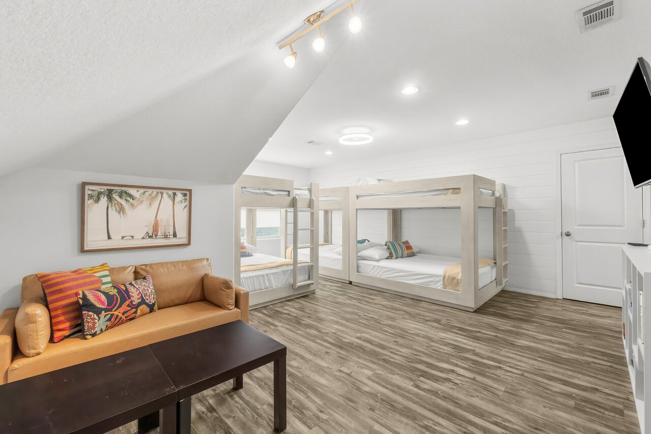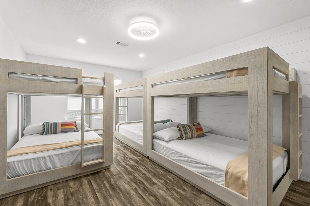Escape to this luxury modern coastal retreat just one mile from the beach, where style, comfort, and convenience come together for the ultimate getaway. Perfect for large families, multi-generational trips, and group vacations, this spacious 4-bedroom, 3-bath beach house rental sleeps up to 20 guests and welcomes your furry friend (one small dog under 25 lbs, pet fee applies). Inside, the open-concept living space features sleek coastal-inspired décor, airy natural tones, and abundant seating for everyone. Relax on the oversized sectional with a 65” SMART TV, gather around the dining table for six, or enjoy cocktails at the chic bar with seating for ten. The newly updated kitchen offers a massive pantry, second refrigerator, and everything you need to prepare family meals with ease. A full-size washer and dryer keep vacation essentials fresh throughout your stay. The King Master suite is a serene retreat with a spa-like ensuite bathroom, including a deep soaker tub, freestanding shower, and dual vanity. Two stylish guest bedrooms—one with a Queen bed, the other with two double beds—share a full bath with tub-shower combo. Upstairs, kids will love their own private bunk room with three sets of full-over-full bunk beds, a 65” SMART TV, and a private bathroom. Step outside to enjoy your outdoor living space with a propane grill and 42” TV—perfect for al fresco dining or movie nights under the stars. Your stay also includes a 6-seater golf cart (license and waiver required), making it easy to explore nearby shops, restaurants, and beach access points. Parking is available for up to 5 vehicles. As an added bonus, every reservation comes with a credit for beach gear rentals—choose from bikes, paddle boards, kayaks, and more, all conveniently delivered to your door. With its blend of modern design, family-friendly amenities, and prime beachside location, this pet-friendly coastal vacation rental has everything you need for a memorable escape. Rental requirements: Guests must be at least 25 years old to rent. During Spring Break, one guest aged 25 or older is required for every two guests under 25.