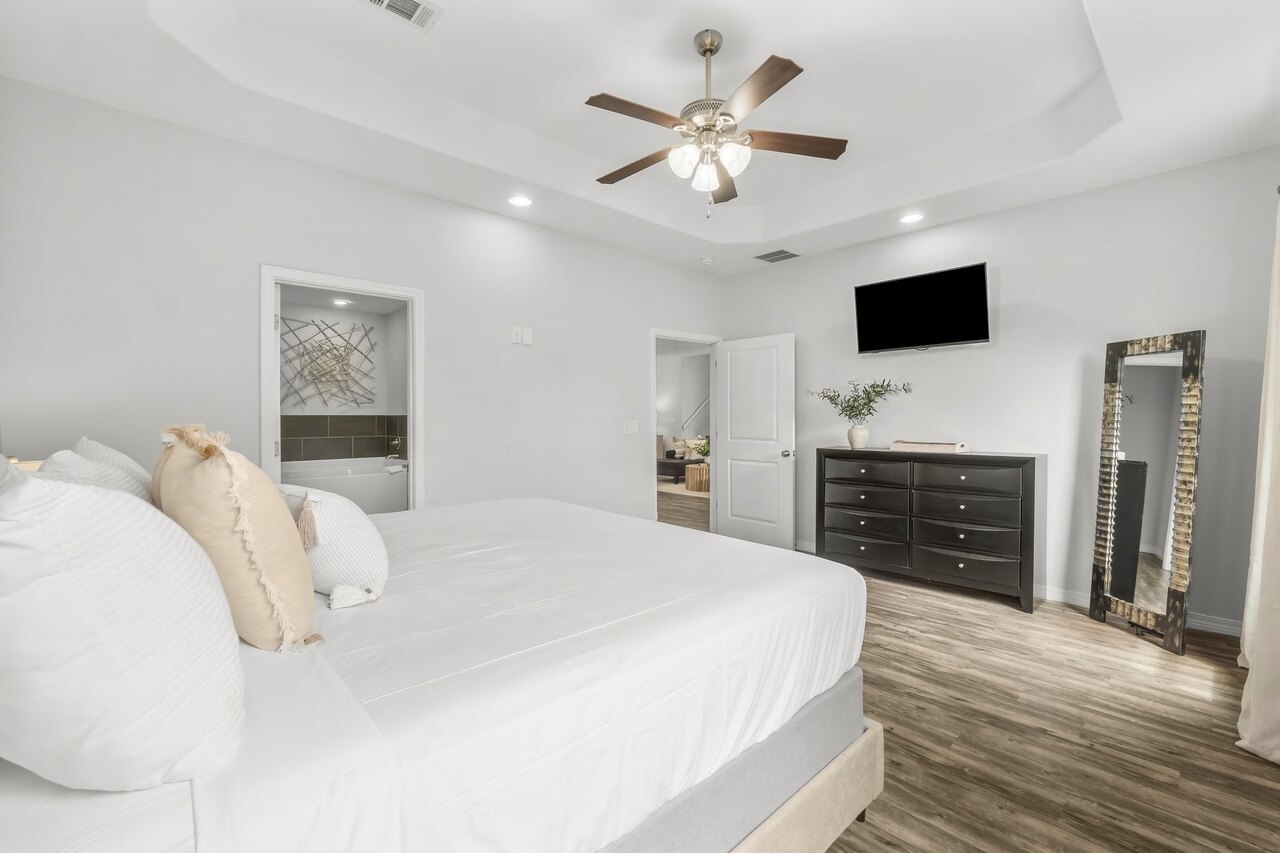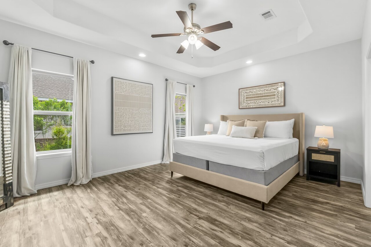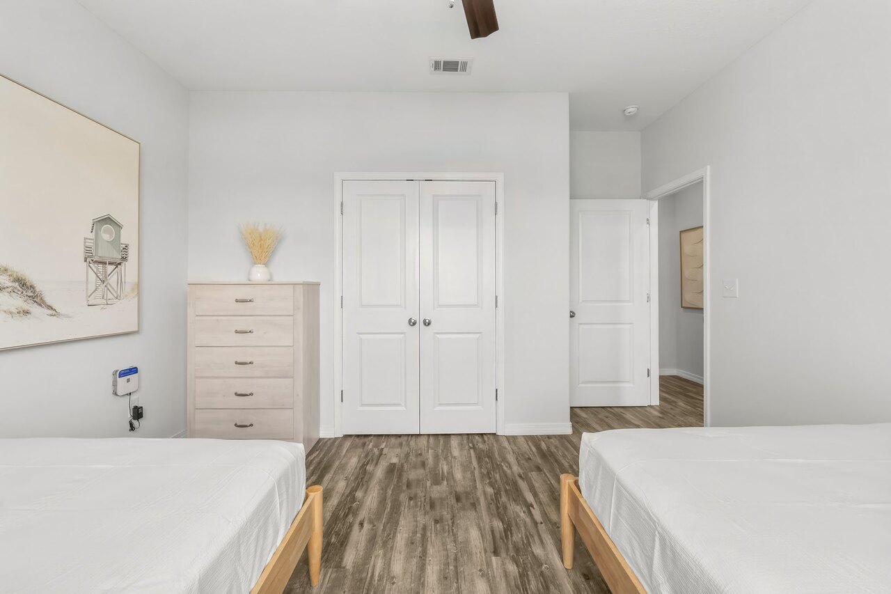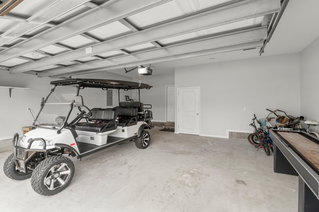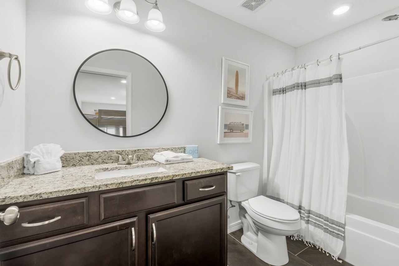 Escape to this luxury modern coastal retreat just one mile from the beach, where style, comfort, and convenience come together for the ultimate getaway. Perfect for large families, multi-generational trips, and group vacations, this spacious 4-bedroom, 3-bath beach house rental sleeps up to 20 guests and welcomes your furry friend (one small dog under 25 lbs, pet fee applies). Inside, the open-concept living space features sleek coastal-inspired décor, airy natural tones, and abundant seating for everyone. Relax on the oversized sectional with a 65” SMART TV, gather around the dining table for six, or enjoy cocktails at the chic bar with seating for ten. The newly updated kitchen offers a massive pantry, second refrigerator, and everything you need to prepare family meals with ease. A full-size washer and dryer keep vacation essentials fresh throughout your stay. The King Master suite is a serene retreat with a spa-like ensuite bathroom, including a deep soaker tub, freestanding shower, and dual vanity. Two stylish guest bedrooms—one with a Queen bed, the other with two double beds—share a full bath with tub-shower combo. Upstairs, kids will love their own private bunk room with three sets of full-over-full bunk beds, a 65” SMART TV, and a private bathroom. Step outside to enjoy your outdoor living space with a propane grill and 42” TV—perfect for al fresco dining or movie nights under the stars. Your stay also includes a 6-seater golf cart (license and waiver required), making it easy to explore nearby shops, restaurants, and beach access points. Parking is available for up to 5 vehicles. As an added bonus, every reservation comes with a credit for beach gear rentals—choose from bikes, paddle boards, kayaks, and more, all conveniently delivered to your door. With its blend of modern design, family-friendly amenities, and prime beachside location, this pet-friendly coastal vacation rental has everything you need for a memorable escape. Rental requirements: Guests must be at least 25 years old to rent. During Spring Break, one guest aged 25 or older is required for every two guests under 25.