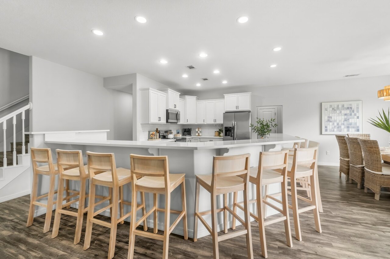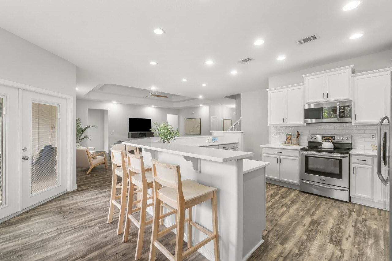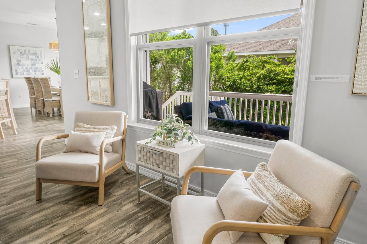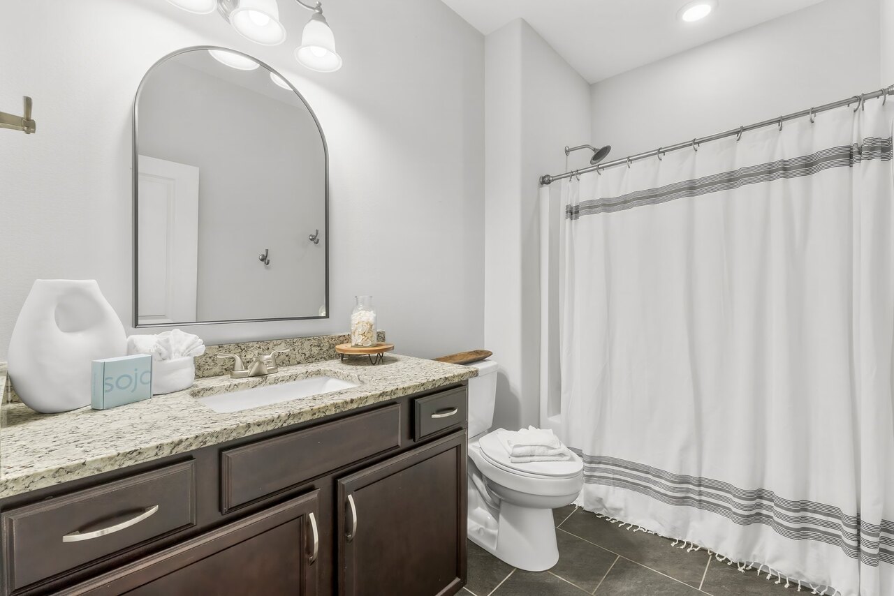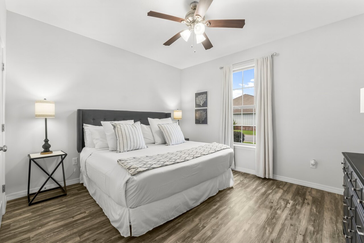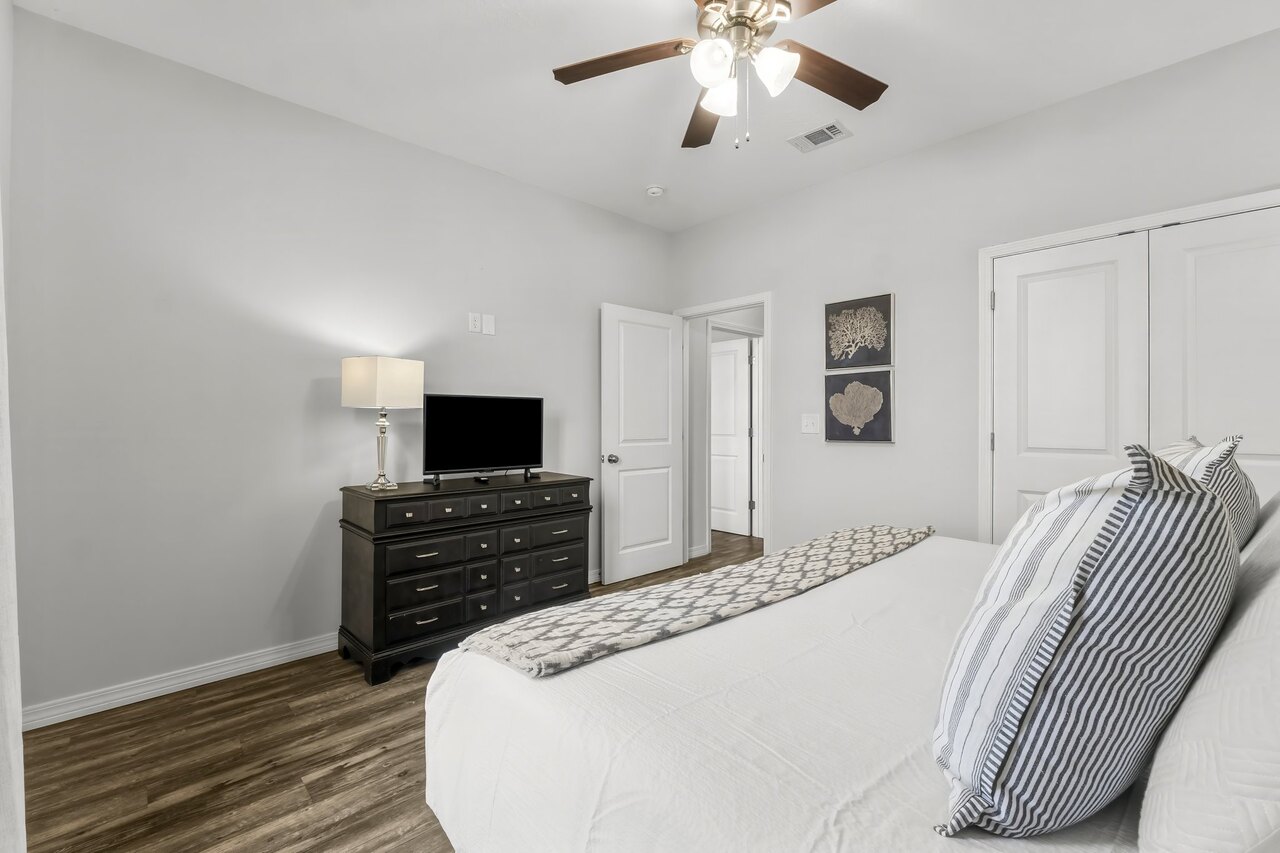 Escape to this luxury modern coastal retreat just one mile from the beach, where style, comfort, and convenience come together for the ultimate getaway. Perfect for large families, multi-generational trips, and group vacations, this spacious 4-bedroom, 3-bath beach house rental sleeps up to 20 guests and welcomes your furry friend (one small dog under 25 lbs, pet fee applies). Inside, the open-concept living space features sleek coastal-inspired décor, airy natural tones, and abundant seating for everyone. Relax on the oversized sectional with a 65” SMART TV, gather around the dining table for six, or enjoy cocktails at the chic bar with seating for ten. The newly updated kitchen offers a massive pantry, second refrigerator, and everything you need to prepare family meals with ease. A full-size washer and dryer keep vacation essentials fresh throughout your stay. The King Master suite is a serene retreat with a spa-like ensuite bathroom, including a deep soaker tub, freestanding shower, and dual vanity. Two stylish guest bedrooms—one with a Queen bed, the other with two double beds—share a full bath with tub-shower combo. Upstairs, kids will love their own private bunk room with three sets of full-over-full bunk beds, a 65” SMART TV, and a private bathroom. Step outside to enjoy your outdoor living space with a propane grill and 42” TV—perfect for al fresco dining or movie nights under the stars. Your stay also includes a 6-seater golf cart (license and waiver required), making it easy to explore nearby shops, restaurants, and beach access points. Parking is available for up to 5 vehicles. As an added bonus, every reservation comes with a credit for beach gear rentals—choose from bikes, paddle boards, kayaks, and more, all conveniently delivered to your door. With its blend of modern design, family-friendly amenities, and prime beachside location, this pet-friendly coastal vacation rental has everything you need for a memorable escape. Rental requirements: Guests must be at least 25 years old to rent. During Spring Break, one guest aged 25 or older is required for every two guests under 25.