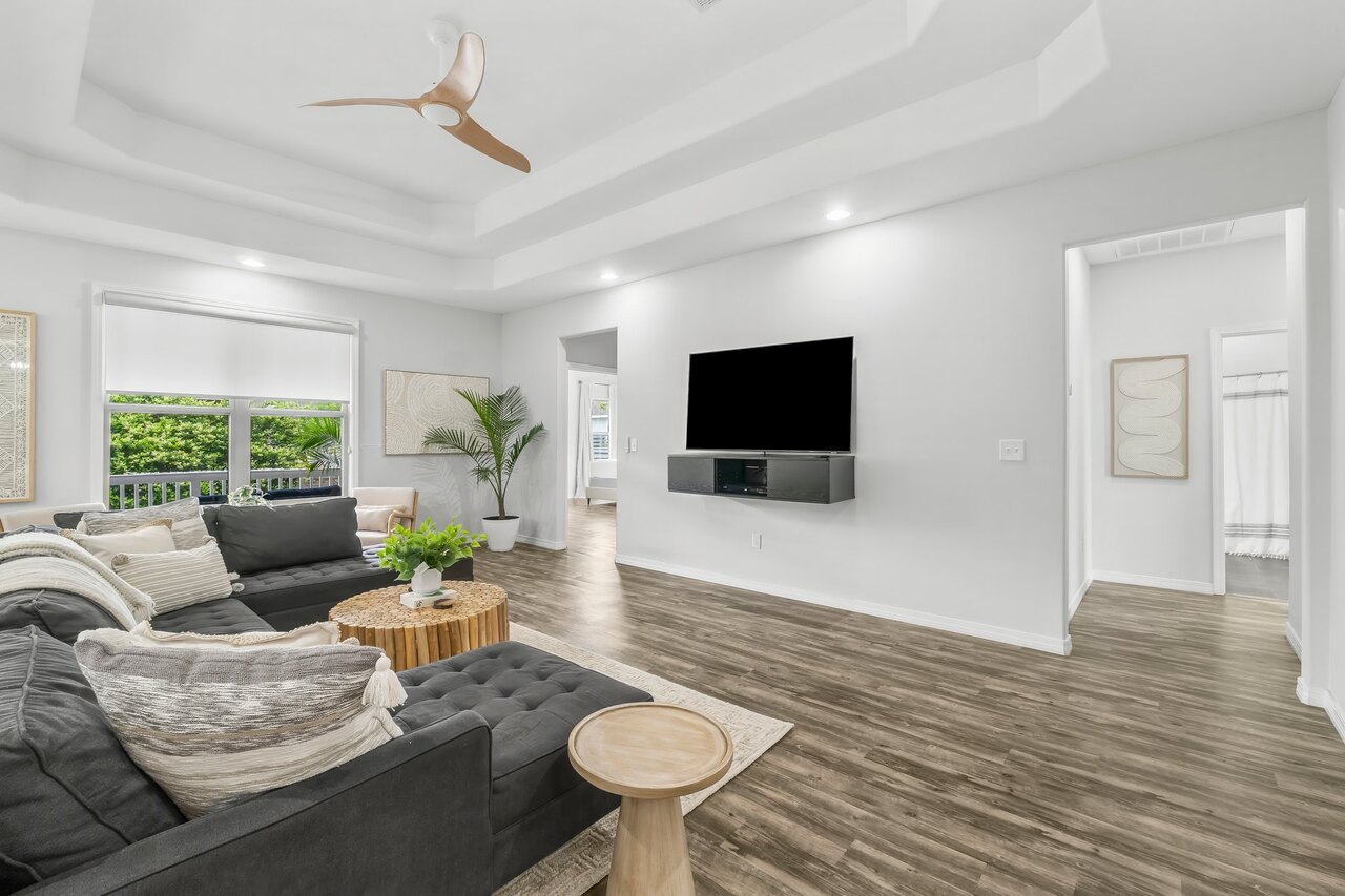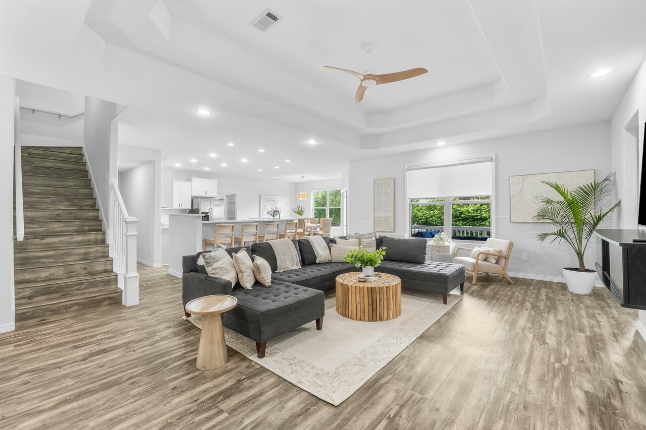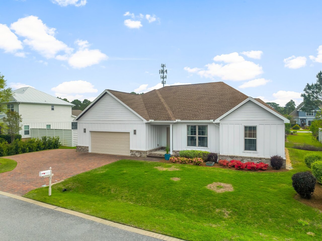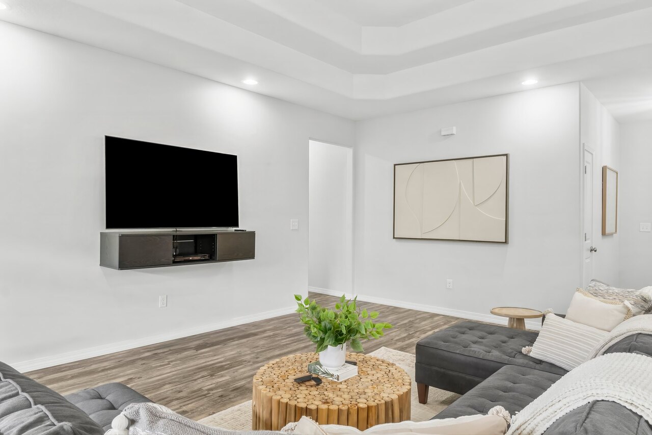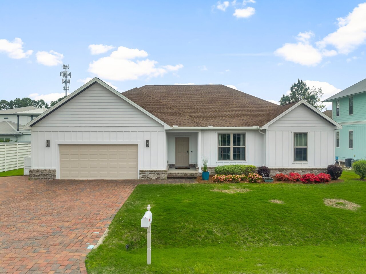 Escape to this luxury modern coastal retreat just one mile from the beach, where style, comfort, and convenience come together for the ultimate getaway. Perfect for large families, multi-generational trips, and group vacations, this spacious 4-bedroom, 3-bath beach house rental sleeps up to 20 guests and welcomes your furry friend (one small dog under 25 lbs, pet fee applies). Inside, the open-concept living space features sleek coastal-inspired décor, airy natural tones, and abundant seating for everyone. Relax on the oversized sectional with a 65” SMART TV, gather around the dining table for six, or enjoy cocktails at the chic bar with seating for ten. The newly updated kitchen offers a massive pantry, second refrigerator, and everything you need to prepare family meals with ease. A full-size washer and dryer keep vacation essentials fresh throughout your stay. The King Master suite is a serene retreat with a spa-like ensuite bathroom, including a deep soaker tub, freestanding shower, and dual vanity. Two stylish guest bedrooms—one with a Queen bed, the other with two double beds—share a full bath with tub-shower combo. Upstairs, kids will love their own private bunk room with three sets of full-over-full bunk beds, a 65” SMART TV, and a private bathroom. Step outside to enjoy your outdoor living space with a propane grill and 42” TV—perfect for al fresco dining or movie nights under the stars. Your stay also includes a 6-seater golf cart (license and waiver required), making it easy to explore nearby shops, restaurants, and beach access points. Parking is available for up to 5 vehicles. As an added bonus, every reservation comes with a credit for beach gear rentals—choose from bikes, paddle boards, kayaks, and more, all conveniently delivered to your door. With its blend of modern design, family-friendly amenities, and prime beachside location, this pet-friendly coastal vacation rental has everything you need for a memorable escape. Rental requirements: Guests must be at least 25 years old to rent. During Spring Break, one guest aged 25 or older is required for every two guests under 25.