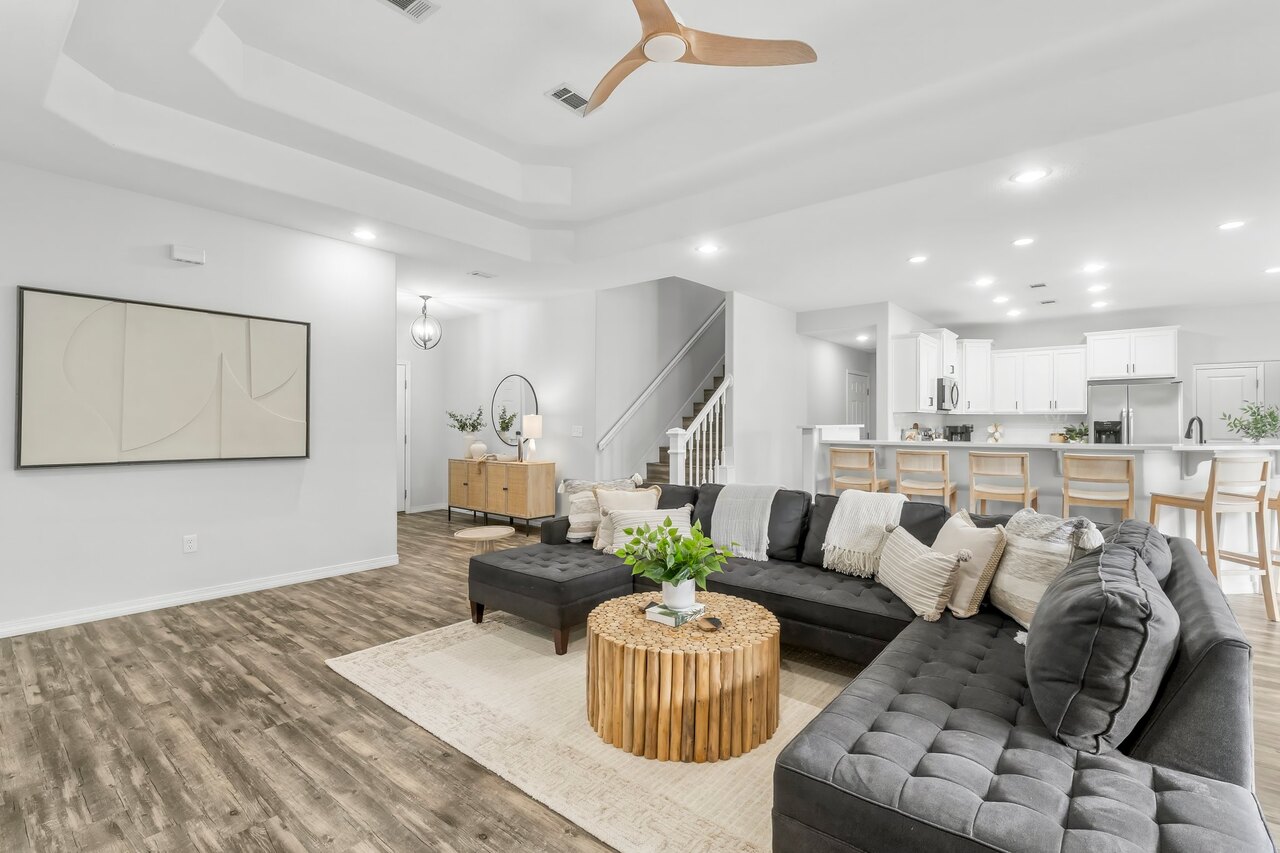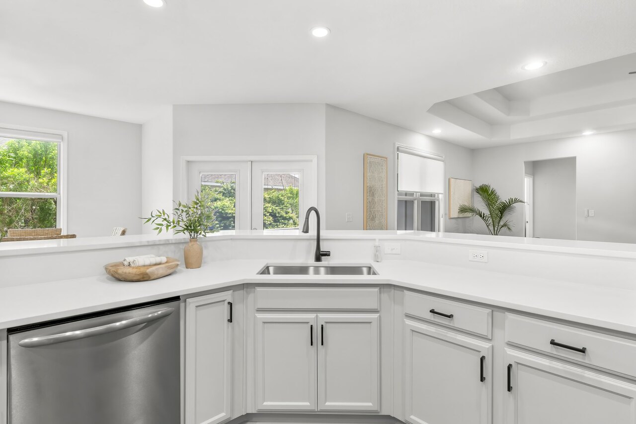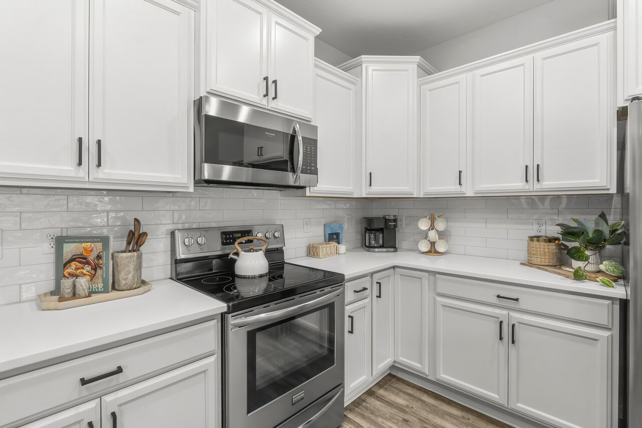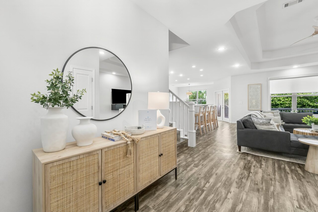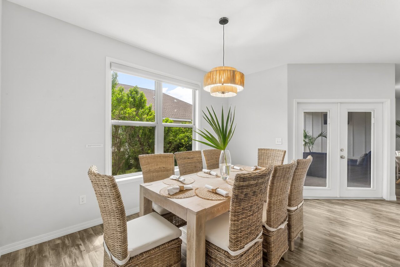 Escape to this luxury modern coastal retreat just one mile from the beach, where style, comfort, and convenience come together for the ultimate getaway. Perfect for large families, multi-generational trips, and group vacations, this spacious 4-bedroom, 3-bath beach house rental sleeps up to 20 guests and welcomes your furry friend (one small dog under 25 lbs, pet fee applies). Inside, the open-concept living space features sleek coastal-inspired décor, airy natural tones, and abundant seating for everyone. Relax on the oversized sectional with a 65” SMART TV, gather around the dining table for six, or enjoy cocktails at the chic bar with seating for ten. The newly updated kitchen offers a massive pantry, second refrigerator, and everything you need to prepare family meals with ease. A full-size washer and dryer keep vacation essentials fresh throughout your stay. The King Master suite is a serene retreat with a spa-like ensuite bathroom, including a deep soaker tub, freestanding shower, and dual vanity. Two stylish guest bedrooms—one with a Queen bed, the other with two double beds—share a full bath with tub-shower combo. Upstairs, kids will love their own private bunk room with three sets of full-over-full bunk beds, a 65” SMART TV, and a private bathroom. Step outside to enjoy your outdoor living space with a propane grill and 42” TV—perfect for al fresco dining or movie nights under the stars. Your stay also includes a 6-seater golf cart (license and waiver required), making it easy to explore nearby shops, restaurants, and beach access points. Parking is available for up to 5 vehicles. As an added bonus, every reservation comes with a credit for beach gear rentals—choose from bikes, paddle boards, kayaks, and more, all conveniently delivered to your door. With its blend of modern design, family-friendly amenities, and prime beachside location, this pet-friendly coastal vacation rental has everything you need for a memorable escape. Rental requirements: Guests must be at least 25 years old to rent. During Spring Break, one guest aged 25 or older is required for every two guests under 25.