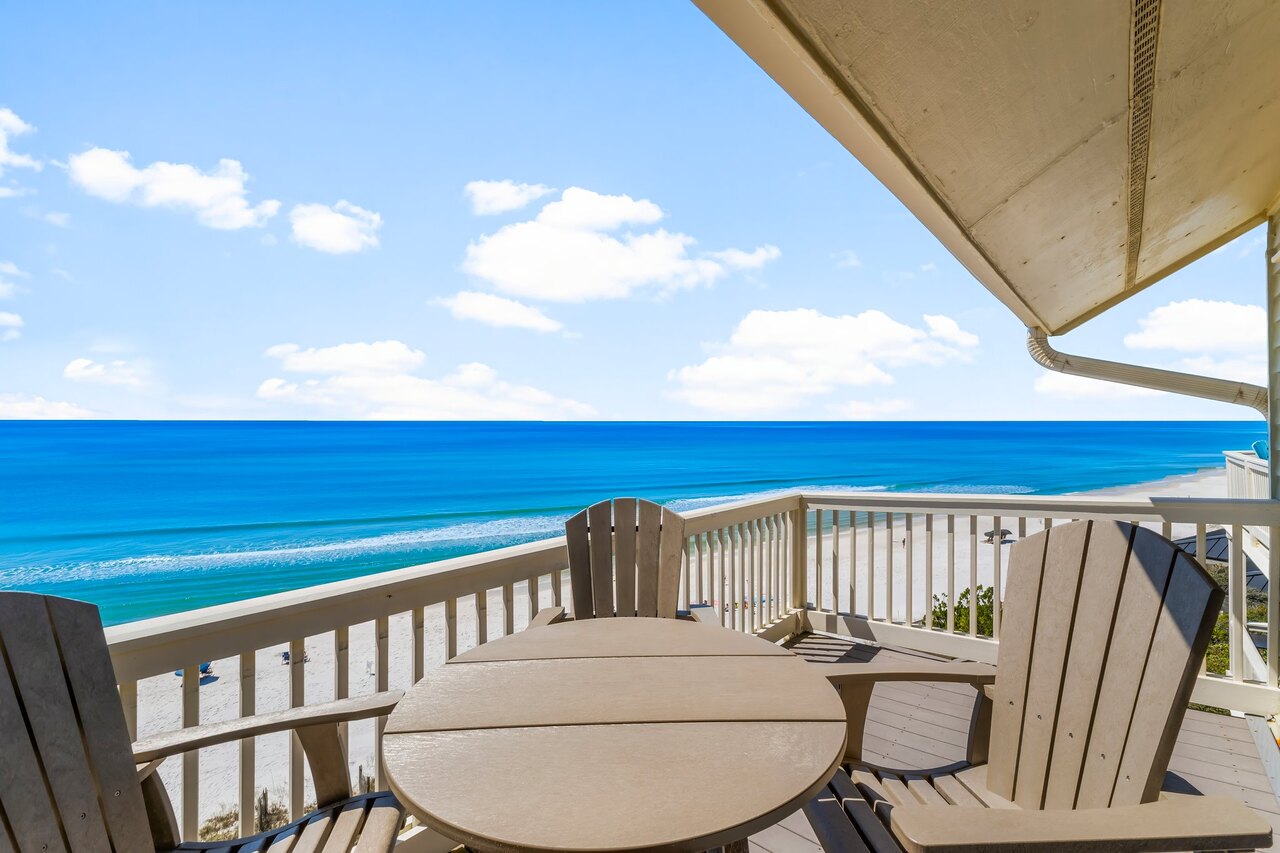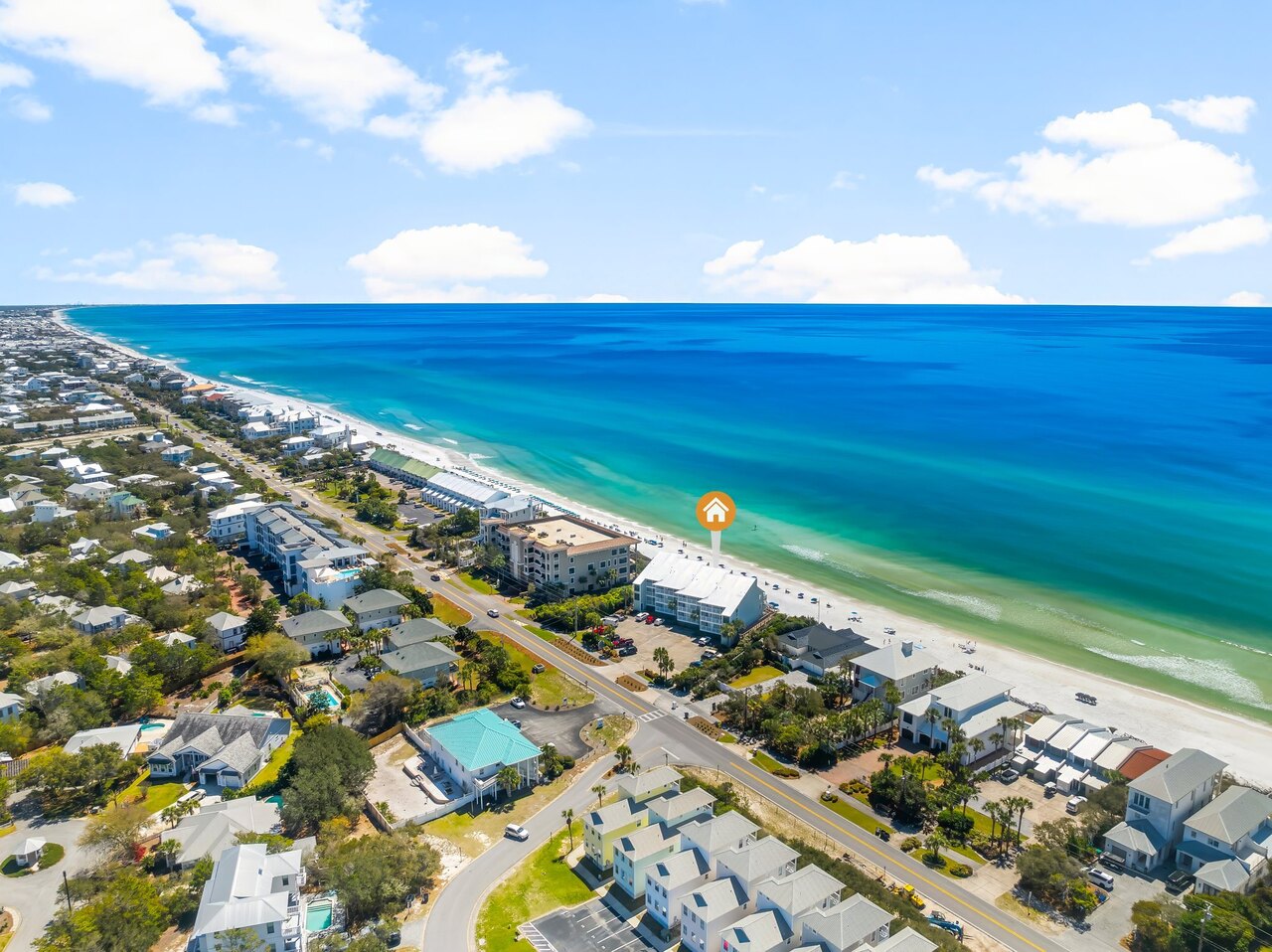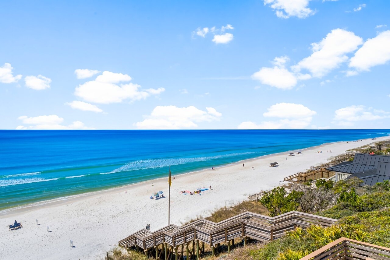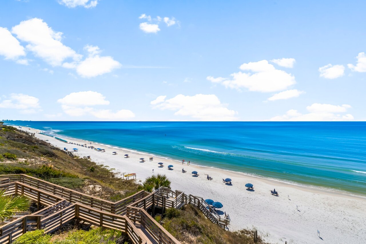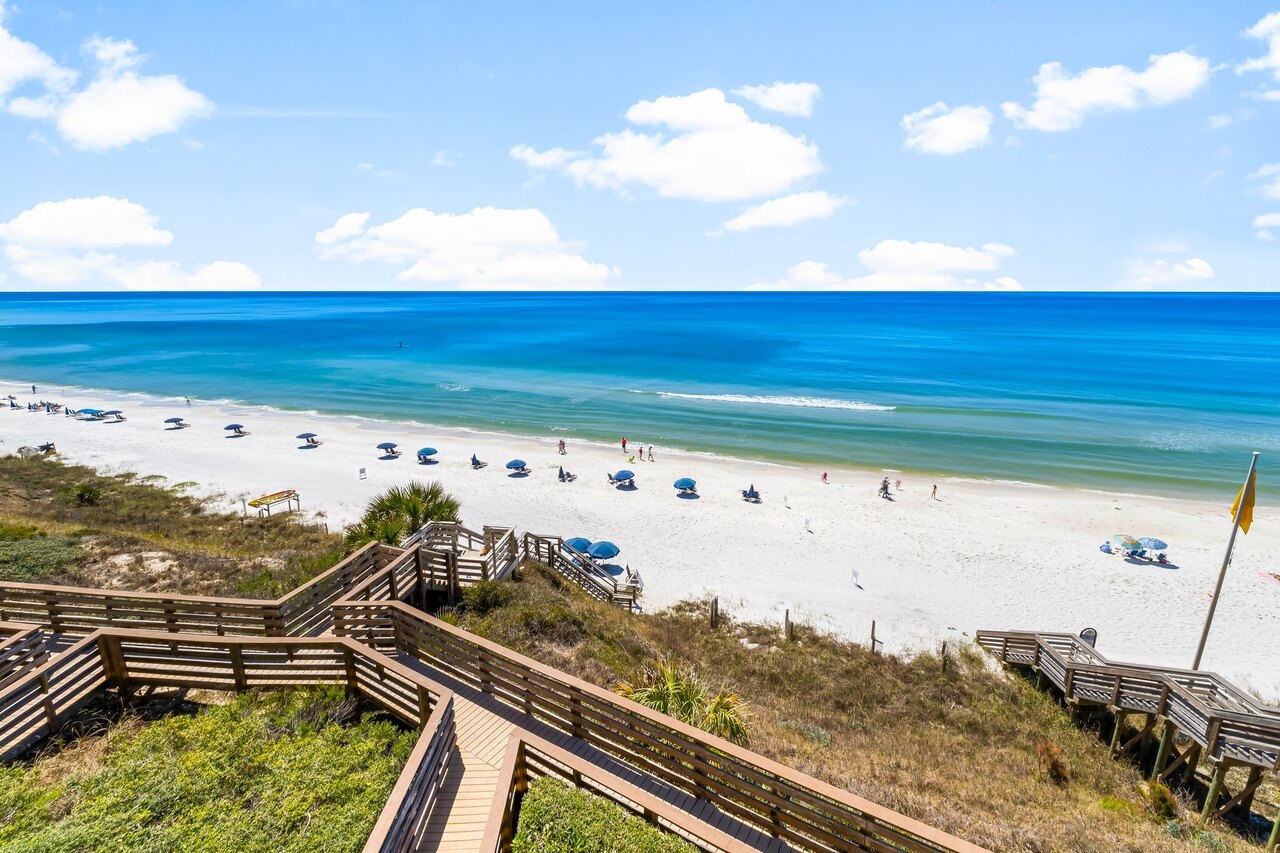 The sparkling blue green water of the Gulf beckons from the moment you open the front door. Follow your instincts and head straight to the jaw dropping gorgeous panoramic view from the balcony. Starting 10/20/25 the resort will be doing a balcony project, during this time there will be workers present on select balconies doing work during the hours of 8-5, the work at times can be noisy, also the parking lot will be affected at times as well. In addition to the pictures, please see the 3D Tour located on the “TOUR” tab above. Mistral 22 was completely renovated in 2025. The new kitchen includes Taj Mahal Quartzite counters and backsplash, new soft close cabinets, a drop-in induction cooktop, new ZLINE stainless appliances, Kohler brushed brass fixtures, 4 bar stools, and is well equipped with everything you need including Henckels cookware and knives, Keurig K-Dou single serve & carafe coffee maker and Ninja blender. The living room includes a large sectional sofa, 65” Samsung smart TV, vaulted ceiling and wall to wall sliding glass door and windows with incredible views of the Gulf. On the balcony is a high-top table and 4 swivel pub arm chairs with panoramic views up and down the beach including an unobstructed western sunset view! The upstairs bedroom includes a Bernhardt Tribeca king size bed, 55” Samsung smart TV, vaulted ceiling with clerestory windows, built-in closet and a new desk & chair (not pictured). The upstairs bathroom includes a Taj Mahal Quartz double vanity, La Marca Calacatta Paonazzo honed porcelain shower, Kohler brushed brass fixtures, and a separate toilet room with pocket door. The downstairs bedroom includes a Bernhardt Sawyer king size bed, a 55” Samsung smart TV and built-in closet. The downstairs bathroom has a Taj Mahal Quartz vanity, Roca Kit-Kat tile shower, Kohler brushed brass fixtures, and a new LG stacked washer and dryer. In the hall there are two bunk beds with removable railing and stairs (pictured with & without). New shiplap and trim were added throughout, as well as new Resolve Coastal Oak floors throughout. The beach in front of Mistral is private and for the exclusive use of Mistral guests. Included in your stay is a complementary beach set-up that includes 2 chairs and an umbrella. To get to the beach simply walk down the stairs and follow the walkway on the first floor around the side of the building and down to the private beach. For your convenience, there are showers and hoses located on the platform near the top of the stairs from the beach. Additional chairs and umbrellas can be arranged for an additional fee. Kayaks and paddle boards are available to rent, and bonfires can also be arranged, all through La Dolce Vita. Also included in your stay are two complementary bikes. The Timpoochee Trail that runs the entire 18-mile length of 30A runs right in front of Mistral. Alys Beach is 1 mile, and Rosemary Beach is 2 miles to the East. Watersound and The Big Chill are 1 mile, Seaside and Watercolor are 6 miles, and Grayton Beach is 8 miles to the West. Publix and Starbucks are located 2 miles away via South Watersound Parkway. Additional bikes can be arranged for an additional fee through La Dolce Vita. Please note: Mistral 22 is on the third floor, and there is no elevator. Only one car is allowed per unit. A parking pass will be provided at check-in. No pets. No parties. No smoking or vaping. You must be at least 25 years of age to rent this property. During Spring Break, the minimum acceptable ratio is one (1) person 25 years of age for every two (2) persons under 25 years of age.