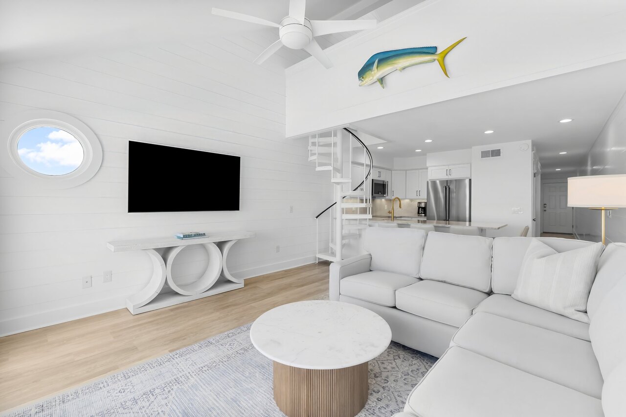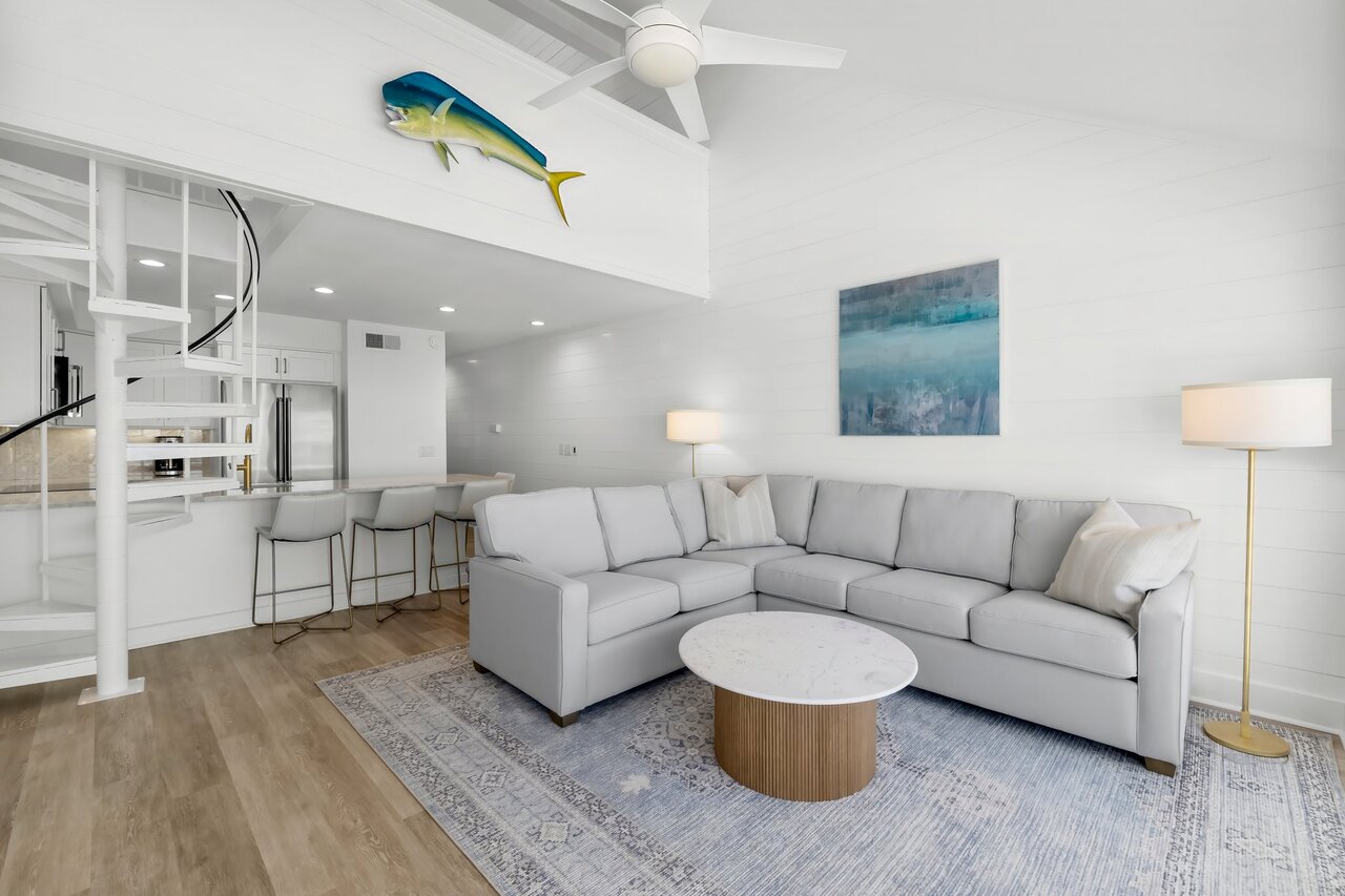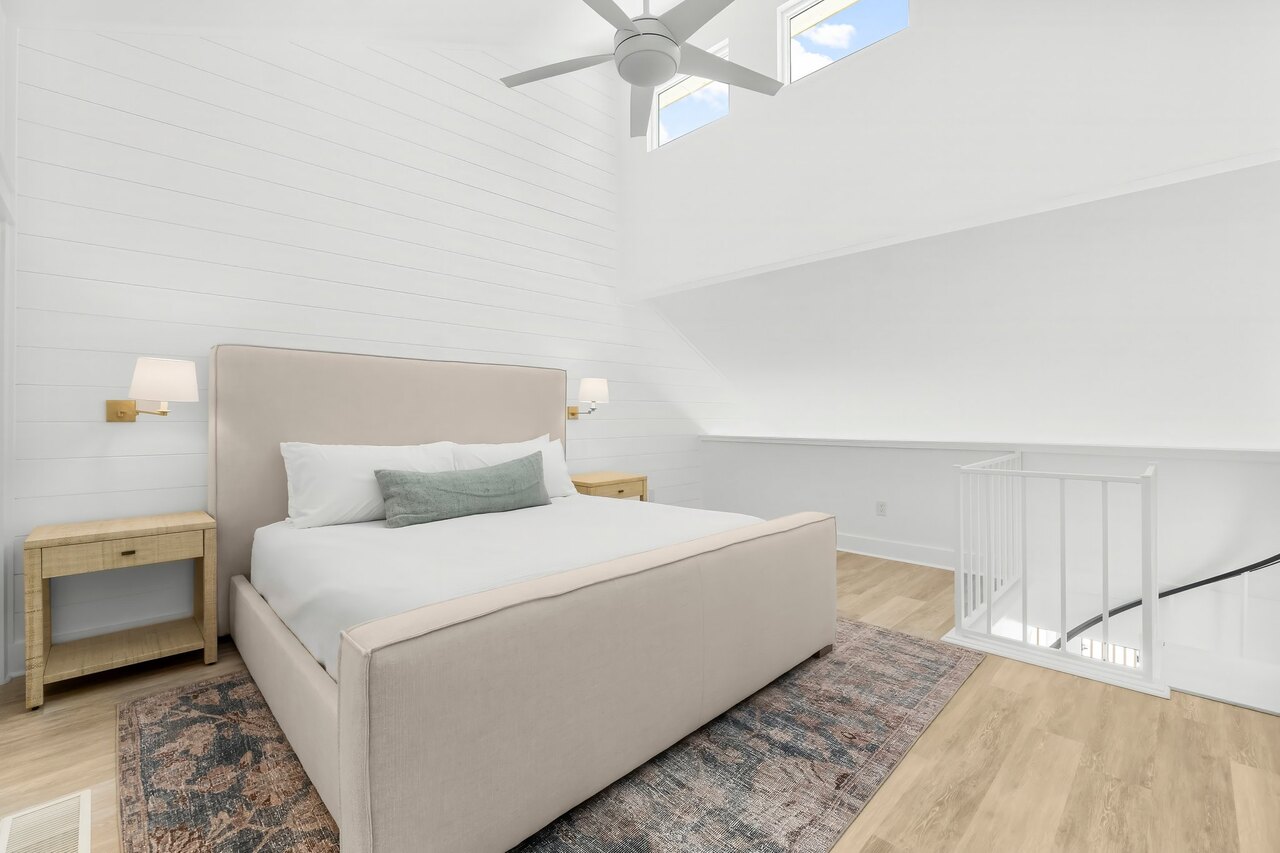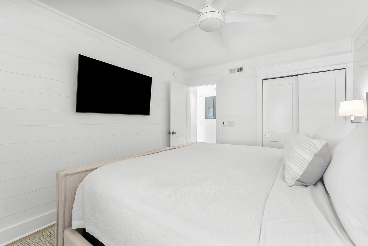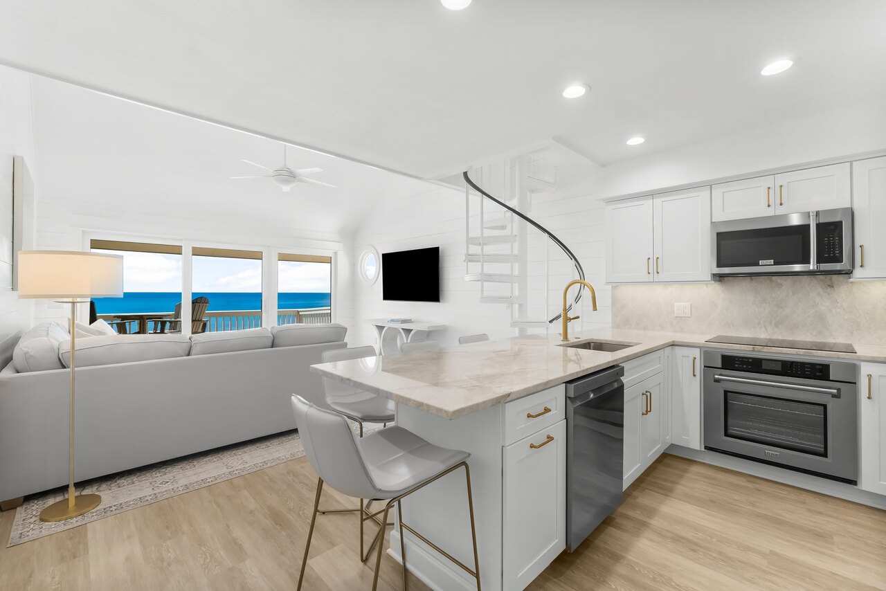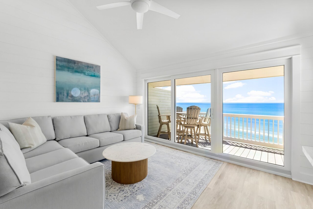 The sparkling blue green water of the Gulf beckons from the moment you open the front door. Follow your instincts and head straight to the jaw dropping gorgeous panoramic view from the balcony. Starting 10/20/25 the resort will be doing a balcony project, during this time there will be workers present on select balconies doing work during the hours of 8-5, the work at times can be noisy, also the parking lot will be affected at times as well. In addition to the pictures, please see the 3D Tour located on the “TOUR” tab above. Mistral 22 was completely renovated in 2025. The new kitchen includes Taj Mahal Quartzite counters and backsplash, new soft close cabinets, a drop-in induction cooktop, new ZLINE stainless appliances, Kohler brushed brass fixtures, 4 bar stools, and is well equipped with everything you need including Henckels cookware and knives, Keurig K-Dou single serve & carafe coffee maker and Ninja blender. The living room includes a large sectional sofa, 65” Samsung smart TV, vaulted ceiling and wall to wall sliding glass door and windows with incredible views of the Gulf. On the balcony is a high-top table and 4 swivel pub arm chairs with panoramic views up and down the beach including an unobstructed western sunset view! The upstairs bedroom includes a Bernhardt Tribeca king size bed, 55” Samsung smart TV, vaulted ceiling with clerestory windows, built-in closet and a new desk & chair (not pictured). The upstairs bathroom includes a Taj Mahal Quartz double vanity, La Marca Calacatta Paonazzo honed porcelain shower, Kohler brushed brass fixtures, and a separate toilet room with pocket door. The downstairs bedroom includes a Bernhardt Sawyer king size bed, a 55” Samsung smart TV and built-in closet. The downstairs bathroom has a Taj Mahal Quartz vanity, Roca Kit-Kat tile shower, Kohler brushed brass fixtures, and a new LG stacked washer and dryer. In the hall there are two bunk beds with removable railing and stairs (pictured with & without). New shiplap and trim were added throughout, as well as new Resolve Coastal Oak floors throughout. The beach in front of Mistral is private and for the exclusive use of Mistral guests. Included in your stay is a complementary beach set-up that includes 2 chairs and an umbrella. To get to the beach simply walk down the stairs and follow the walkway on the first floor around the side of the building and down to the private beach. For your convenience, there are showers and hoses located on the platform near the top of the stairs from the beach. Additional chairs and umbrellas can be arranged for an additional fee. Kayaks and paddle boards are available to rent, and bonfires can also be arranged, all through La Dolce Vita. Also included in your stay are two complementary bikes. The Timpoochee Trail that runs the entire 18-mile length of 30A runs right in front of Mistral. Alys Beach is 1 mile, and Rosemary Beach is 2 miles to the East. Watersound and The Big Chill are 1 mile, Seaside and Watercolor are 6 miles, and Grayton Beach is 8 miles to the West. Publix and Starbucks are located 2 miles away via South Watersound Parkway. Additional bikes can be arranged for an additional fee through La Dolce Vita. Please note: Mistral 22 is on the third floor, and there is no elevator. Only one car is allowed per unit. A parking pass will be provided at check-in. No pets. No parties. No smoking or vaping. You must be at least 25 years of age to rent this property. During Spring Break, the minimum acceptable ratio is one (1) person 25 years of age for every two (2) persons under 25 years of age.