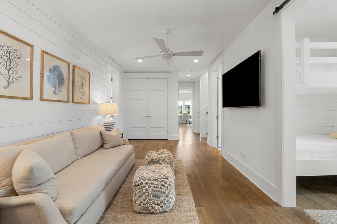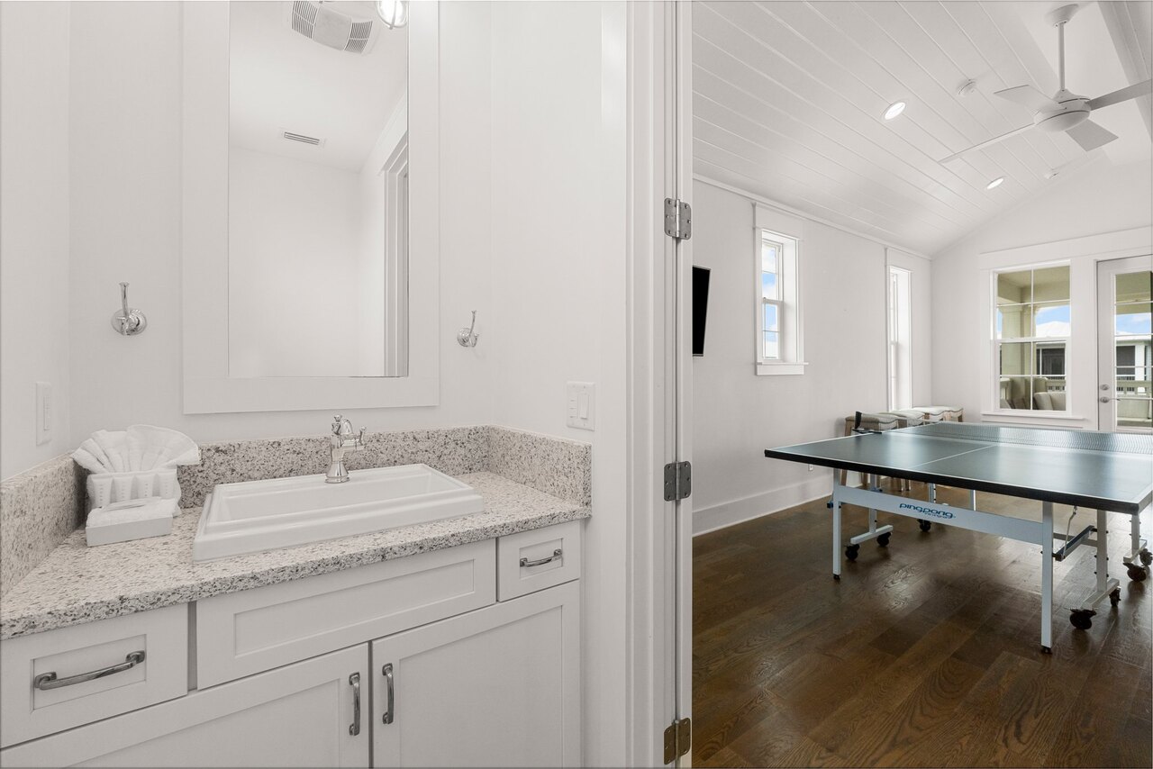 LAGOON POOL & POOL DECK CLOSURE: October 27, 2025-November 24, 2025. Planned closure for resurfacing. We apologize for the inconvenience. Rossana’s Beach House is a newly constructed home in popular Seacrest Beach, snuggled in between Aly’s Beach and Rosemary Beach. Surrounded by endless dining, shopping and entertainment, your family can always find something to do. Opt for walking 5 minutes to the beach or hop on the complimentary shuttle service (runs seasonally). You are steps away from the 12,000 square foot lagoon pool. Parking for 2 cars only NO GOLF CARTS ALLOWED! When you arrive at the home you will have parking for five cars and easy access to the property. Upon entering this new and exquisite five bedroom, five and a half bathroom retreat, you enter the open concept kitchen, living and dining room with a touch of coastal elegance that was expertly designed with gray stained oak floors, imported tile flooring, white marble and granite counters, and Kitchen Aid appliances. The living room has plenty of plush seating for the entire family. You will find the first king guest bedroom just beyond the kitchen featuring a private bath. As you enter the second floor, straight ahead you will enter the “shiplap” master bedroom with king bed and private bath with walk in shower and soaking tub. You also have a private balcony off the master. Across from the master bedroom you will find the fun bunk room with four built in bunks and a shared bathroom. On the other side of the bathroom you will find the third king guest bedroom with private bath. On the North East corner of the home on the second floor you will find the fourth king guest bedroom with private bath. On the third floor you will be entering the homes playground, so to speak. Enjoy game nights in the game room with ping pong table and dart board or walk into the home theatre room to watch a movie or big game on an eighty inch television with surround sound and theatre seating. The third floor deck features a covered patio with a grill station and sunset viewing area. Overview: *100 steps to community pool and amphitheater *complimentary tram service to beach and back (March-October) *5 bedrooms, 5 full baths and 2 half baths *3,469 sq ft *Wi-Fi *home theatre room with 80’ TV Overnight: *king bed first floor guest bedroom; private bath; TV *king master bedroom second floor; private bath; TV; private balcony *king guest bedroom second floor; private bath; TV *twin bunk room (four twins); shared bath; TV *king guest bedroom second floor; private bath; TV *sleeper sofa 2nd floor sitting area This home includes a credit based on the duration of your stay for additional amenities offered by VayKGear such as bikes, paddleboards, games and chairs. You will receive a notification after you confirm your reservation with additional details. You must be at least 25 years of age to rent this property. During Spring Break , the minimum acceptable ratio is one (1) person 25 years of age for every two (2) persons under 25 years of age. NO USE OF FIRE PIT FROM APRIL 1-SEPT.31