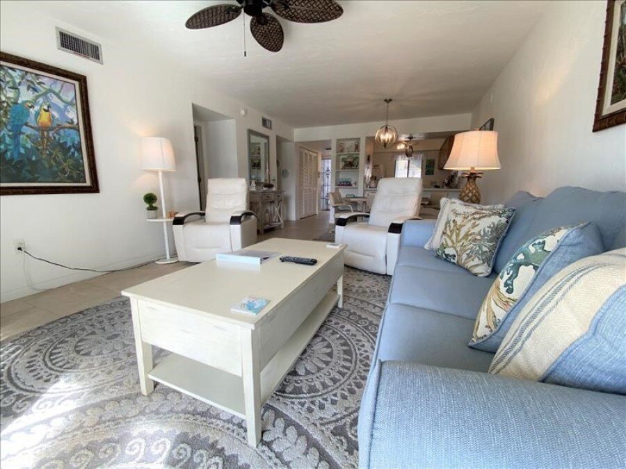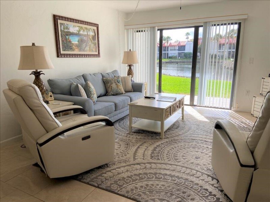 Wake up to the view of paradise in this beachy 2 bedroom/ 2 bathroom, first floor condo located directly waterfront on the bay of Anna Maria Island! This condo is perfect for that romantic getaway or small family vacation that you’ve been waiting for. The Runaway Bay complex is right across the street from the Gulf of Mexico, only a short walk to warm sand and dazzling teal water. WHEN RENTING GOLF CARTS - GAS ONLY. NO ELECTRIC AS OF 2/10/25 ALL AMENITIES INCLUDING POOL AND FITNESS CENTER ARE NON-FUNCTIONING DUE TO HURRICANES MILTON AND HELENE. We hope you have the opportunity to enjoy some of the unique features of this beautiful unit: • Carefree check-in, go straight to your unit no office visit required • Fully equipped kitchen including stove, fridge, dishwasher, microwave, and coffee maker • TV’s in the living room and Master Bedroom. • Free WIFI • Both bathrooms have tub/shower combos • Queen bed in the master bedroom • 2 twin beds in the second bedroom, great for kids • Washer and dryer in unit • Furnished patio with wide open view of the pond fountain • 1st floor unit • Bath Towels and Quality Linens provided The Runaway Bay Condominium has a lot to offer our guests: • Tennis Court • Fitness Center • Largest Solar Heated Swimming Pool on Island • Shuffle Board • Bocce Ball • Clubhouse with wifi • Deeded Beach access across street • Beautiful Fishing Pier • Charcoal Grills on property for guest use • On-Site Rental Management office • Kayak & Canoe Launch There is also a lot to do in the surrounding area: Runaway Bay is in walking distance from the Historic Bridge Street, the Hub of entertainment in this wonderful beach community, a street where you can shop, dine, and play from beach to bay. The free trolley also makes a stop on Gulf Drive, right in front of Runaway Bay’s complex. Take the trolley to the beach or anywhere else you want to visit on the island without worrying about getting sand in your car. Visit downtown Anna Maria Island, Holmes Beach, or any of the local restaurants or establishments. You can even jump on the trolley for just a scenic ride around the island! In addition to the free trolleys, locals and visitors alike can travel up and down the island for exceptional quality seafood restaurants and coastal living shops via bike, golf cart, kayak, or boat. This area also offers a great variety of boat tours, fishing charters, parasailing, scuba diving, and Golf among many other exciting activities. There is no better way to experience Florida’s Gulf Coast than spending your vacation at Anna Maria Island. Whether you’re booking a family vacation or a trip with friends, be sure to call your travel agent and make reservations at this coastal condo at Runaway Bay!