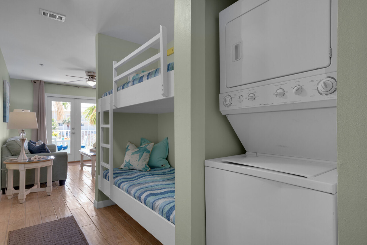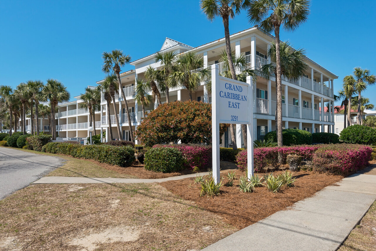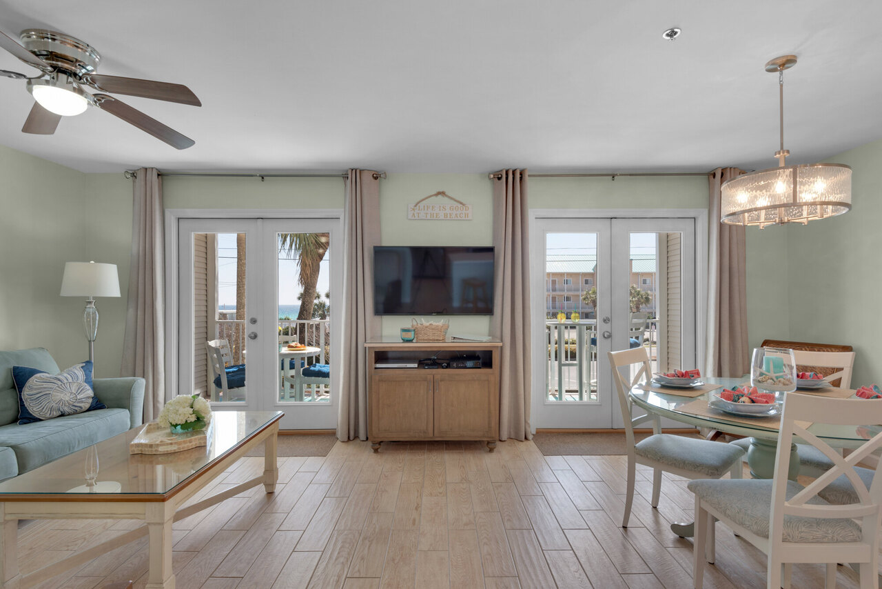 Grand Caribbean East #202 is a spacious second floor, 2-bedroom, 2-bath condo in Destin’s desirable Crystal Beach neighborhood! The subtle coastal decor makes this condo light and relaxing. It's the perfect location for your next Girls Trip, Mother-Daughter Getaway, Couples Retreat, or Family Vacation. Enjoy water views from our wide balcony — it’s the perfect spot for sunrise coffee or sunset drinks! The sugar-white beaches and beautiful emerald-green waters of the Gulf are easily accessed by a dedicated walkway located directly across the street. This 1080 sq. ft. condo sleeps 6 —The master suite features a King bed, plenty of drawer and closet space, a dressing table/desk with large mirror and chair, TV, ceiling fan. The master bathroom features a sliding door to maximize space, a walk-in shower, floor to ceiling tile, lots of light, hair dryer. The guest suite features a Queen bed, plus a Daybed w/Trundle, large dresser with mirror, cube storage, TV, DVD player, ceiling fan – plus en suite access to the guest bathroom which features a tub with floor to ceiling tile surround. Twin Bunks are located in the hall! A new washer and dryer unit is conveniently located next to the bunks. In the Living/Dining area, you’ll find a smart TV, ceiling fan, console cabinet filled with games, books and puzzles. Two sets of French doors lead to the balcony. The kitchen is very well-appointed with stainless steel appliances, ice maker, plenty of dishes, utensils, small appliances, and a spacious pantry. Amenities include a heated Pool (seasonally), Hot Tub and two Community-Grilling areas with picnic tables surrounded by well-kept grounds and private parking directly behind the building. Complimentary internet is provided as well. The property has 3 sets of wide stairs spaced out for easy access. Crystal Beach is a family friendly community with bike/walking paths that stretch the entire length of Scenic 98. Along with enjoying Destin’s top-rated fishing and beaches, be sure to check out our locally owned restaurants and shopping. Experience everything Destin has to offer while staying at Grand Caribbean East #202 aka “Emerald Lyme”! It’s the perfect place to enjoy your Vacation by the Beach! You must be at least 25 years of age to rent this property. During Spring-Break, the minimum acceptable ratio is one (1) person 25 years of age for every two (2) persons under 25 years of age.