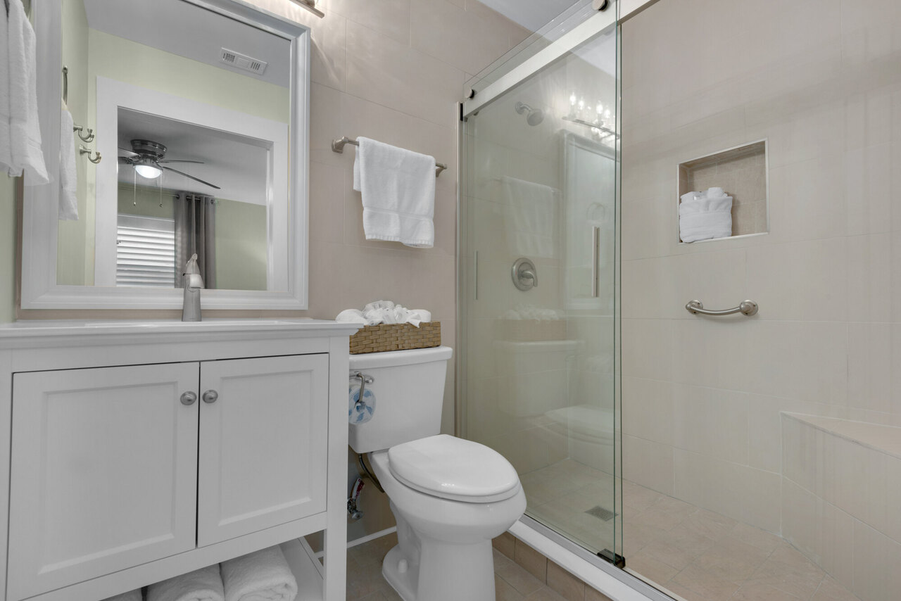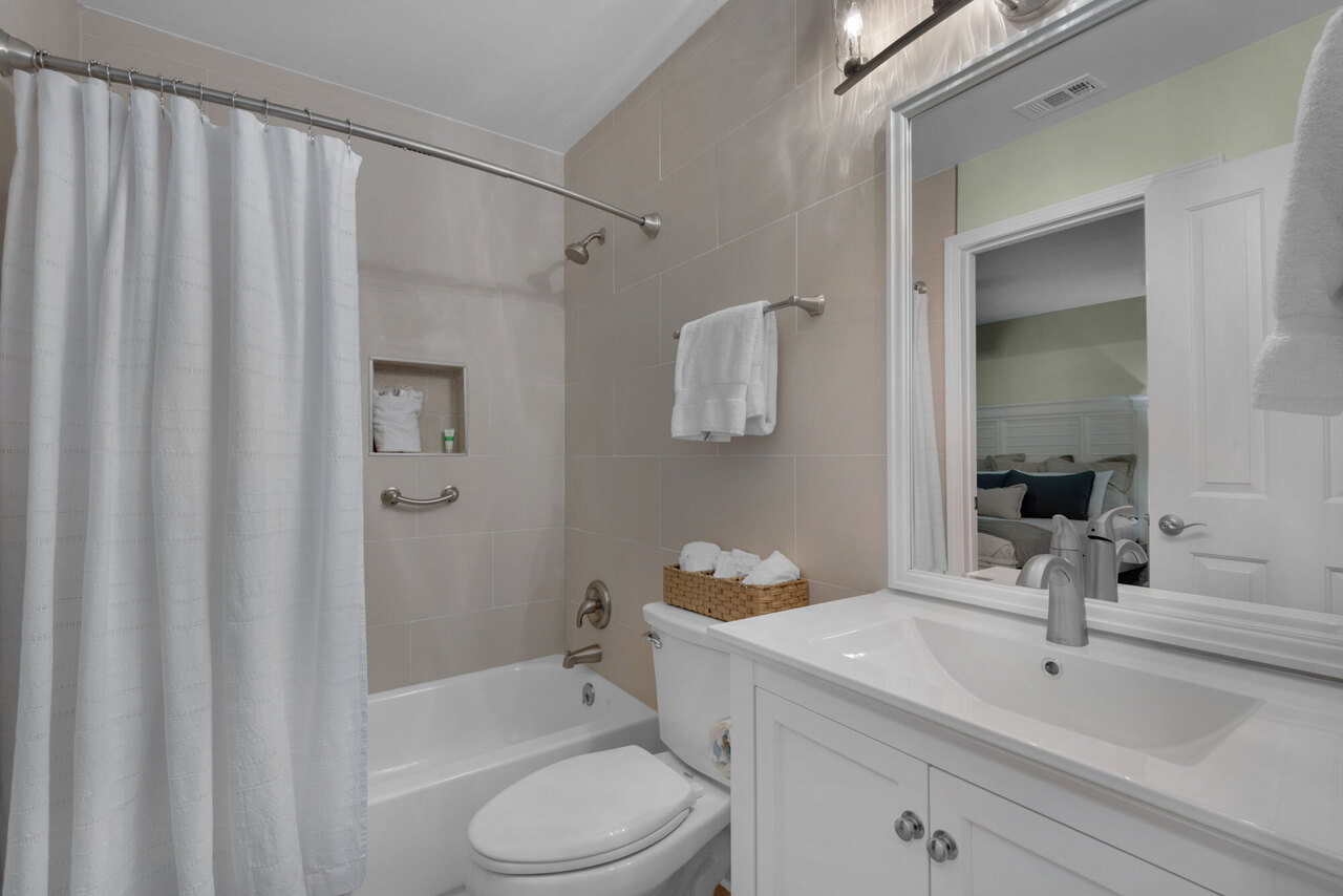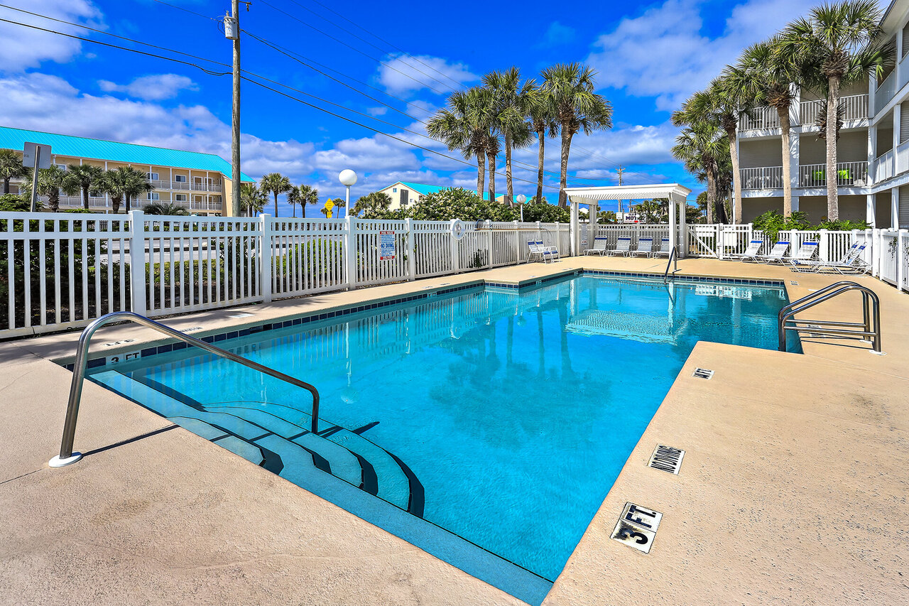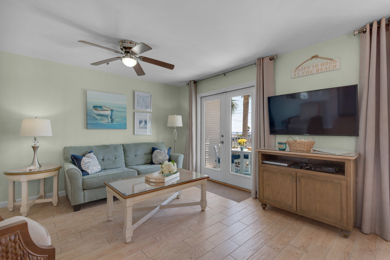 Grand Caribbean East #202 is a spacious second floor, 2-bedroom, 2-bath condo in Destin’s desirable Crystal Beach neighborhood! The subtle coastal decor makes this condo light and relaxing. It's the perfect location for your next Girls Trip, Mother-Daughter Getaway, Couples Retreat, or Family Vacation. Enjoy water views from our wide balcony — it’s the perfect spot for sunrise coffee or sunset drinks! The sugar-white beaches and beautiful emerald-green waters of the Gulf are easily accessed by a dedicated walkway located directly across the street. This 1080 sq. ft. condo sleeps 6 —The master suite features a King bed, plenty of drawer and closet space, a dressing table/desk with large mirror and chair, TV, ceiling fan. The master bathroom features a sliding door to maximize space, a walk-in shower, floor to ceiling tile, lots of light, hair dryer. The guest suite features a Queen bed, plus a Daybed w/Trundle, large dresser with mirror, cube storage, TV, DVD player, ceiling fan – plus en suite access to the guest bathroom which features a tub with floor to ceiling tile surround. Twin Bunks are located in the hall! A new washer and dryer unit is conveniently located next to the bunks. In the Living/Dining area, you’ll find a smart TV, ceiling fan, console cabinet filled with games, books and puzzles. Two sets of French doors lead to the balcony. The kitchen is very well-appointed with stainless steel appliances, ice maker, plenty of dishes, utensils, small appliances, and a spacious pantry. Amenities include a heated Pool (seasonally), Hot Tub and two Community-Grilling areas with picnic tables surrounded by well-kept grounds and private parking directly behind the building. Complimentary internet is provided as well. The property has 3 sets of wide stairs spaced out for easy access. Crystal Beach is a family friendly community with bike/walking paths that stretch the entire length of Scenic 98. Along with enjoying Destin’s top-rated fishing and beaches, be sure to check out our locally owned restaurants and shopping. Experience everything Destin has to offer while staying at Grand Caribbean East #202 aka “Emerald Lyme”! It’s the perfect place to enjoy your Vacation by the Beach! You must be at least 25 years of age to rent this property. During Spring-Break, the minimum acceptable ratio is one (1) person 25 years of age for every two (2) persons under 25 years of age.
