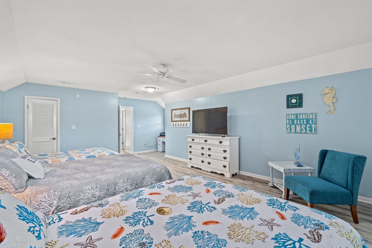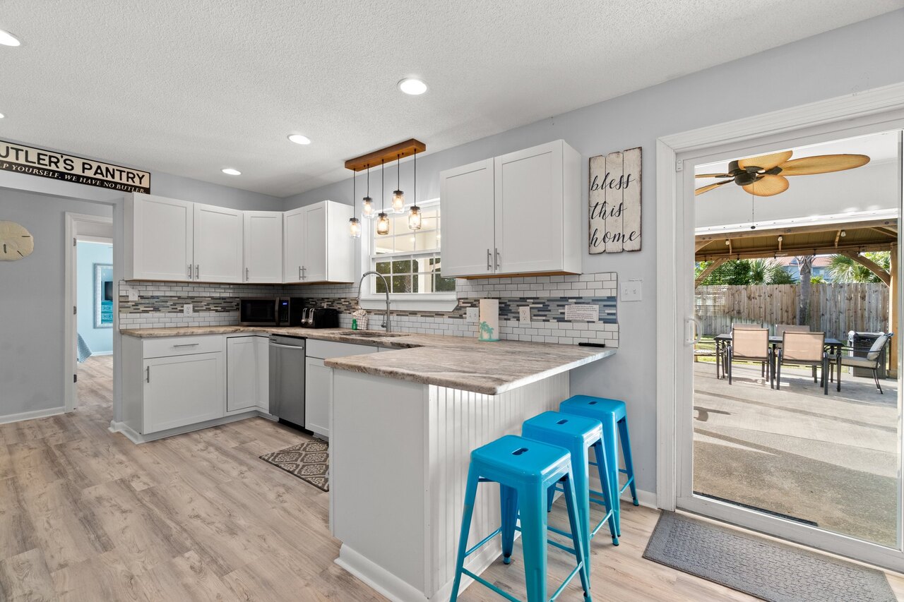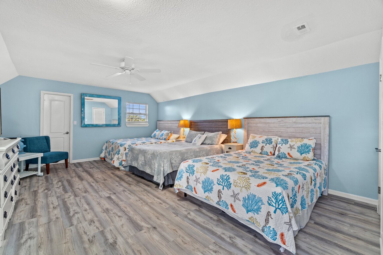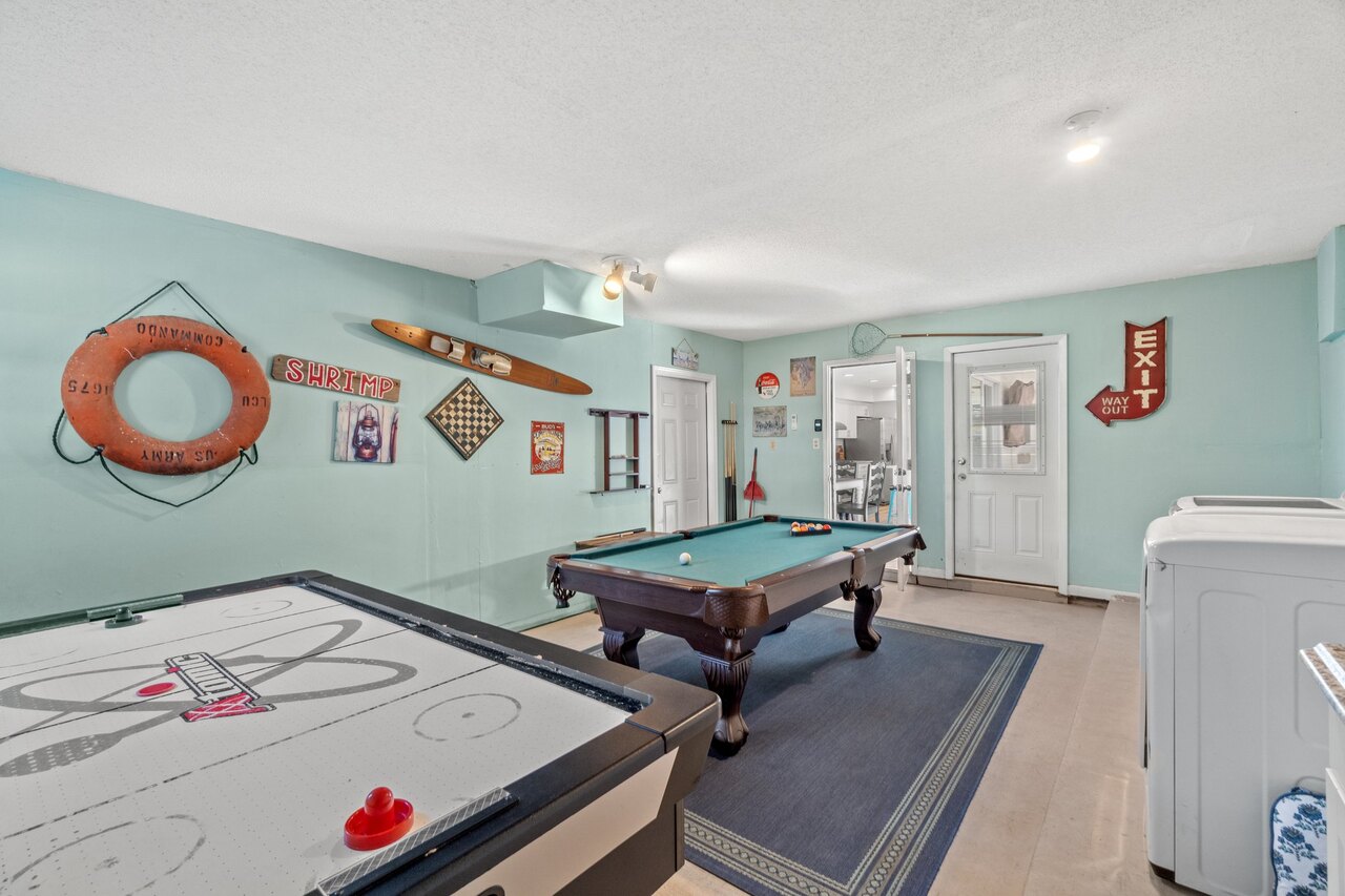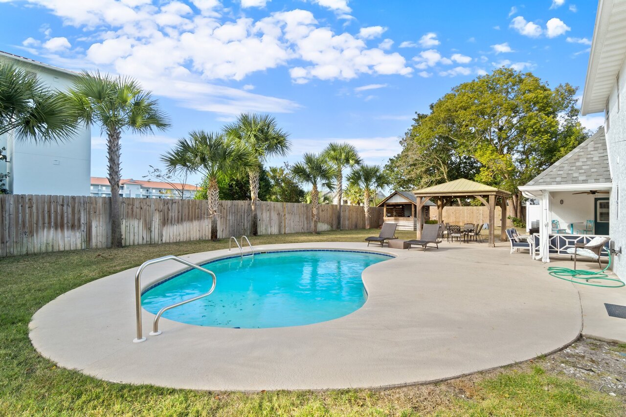 Welcome to the FLIP FLOP STOP! This large 4 bedroom home is located in the quiet west end of Panama City Beach and is dog friendly, you can have 2 dogs with a limit of 25 pounds each for a nonrefundable fee. Far from the hustle and bustle yet close to the beach and Pier Park. The perfect place for a family beach getaway! The owners have just completed a complete renovation with new paint, furnishings, and outdoor fire pit and much more. Carefree check in is easy. You’ll get an access code for the home so that you can go directly to the house without checking in at some office. Plus, there’s room for up to three vehicles. Let’s take a tour: Outside You’ll really enjoy the outdoors of Flip Flop Stop. From the heated private pool (which you can heat for a small extra charge) to the outdoor kitchen and bar and fire pit there’s plenty to enjoy here. And there’s room for rover to room too. And if you want to catch the latest game while you’re outdoors there’s a 55” SMART TV on the patio! But that’s just the beginning. For all you bikers, car enthusiasts, and fishermen, there’s enough parking space for your boat or your enclosed trailer. First Floor When you step in the downstairs area, you’ll see the large living room with 55” SMART TV mounted on the wall and the seating surrounding it so there’s plenty of room to relax and watch your favorite shows after a day at the beach. There’s also a queen sleeper for extra sleeping space. From there check out the large dining table with seating for 10. Family dinners every day! Next to that the large kitchen with new stainless appliances, granite counters and refreshed cabinetry. It’s ready for you to fix the family meals whenever you want. When the kids are done eating, they can head to the game room that’s equipped with both a pool table and an air hockey table. Let the games begin. The master suite downstairs has a king bed, large SMART TV and an ensuite bath with tub/shower combination. The second bedroom has a Queen bed. Second Floor Head upstairs where the second master has a king bed 46” SMART TV and a balcony for outdoor relaxing when you’re not around the pool or the firepit in the backyard. The loft bedroom has 3 queen beds and a 55” SMART TV. There’s a bath equipped with a tub/shower combination for everyone upstairs. Make sure you book your vacation early! FLIP FLOP STOP is booking up for spring break and summer. You must be at least 25 years of age to rent this property. During Spring Break , the minimum acceptable ratio is one (1) person 25 years of age for every two (2) persons under 25 years of age.