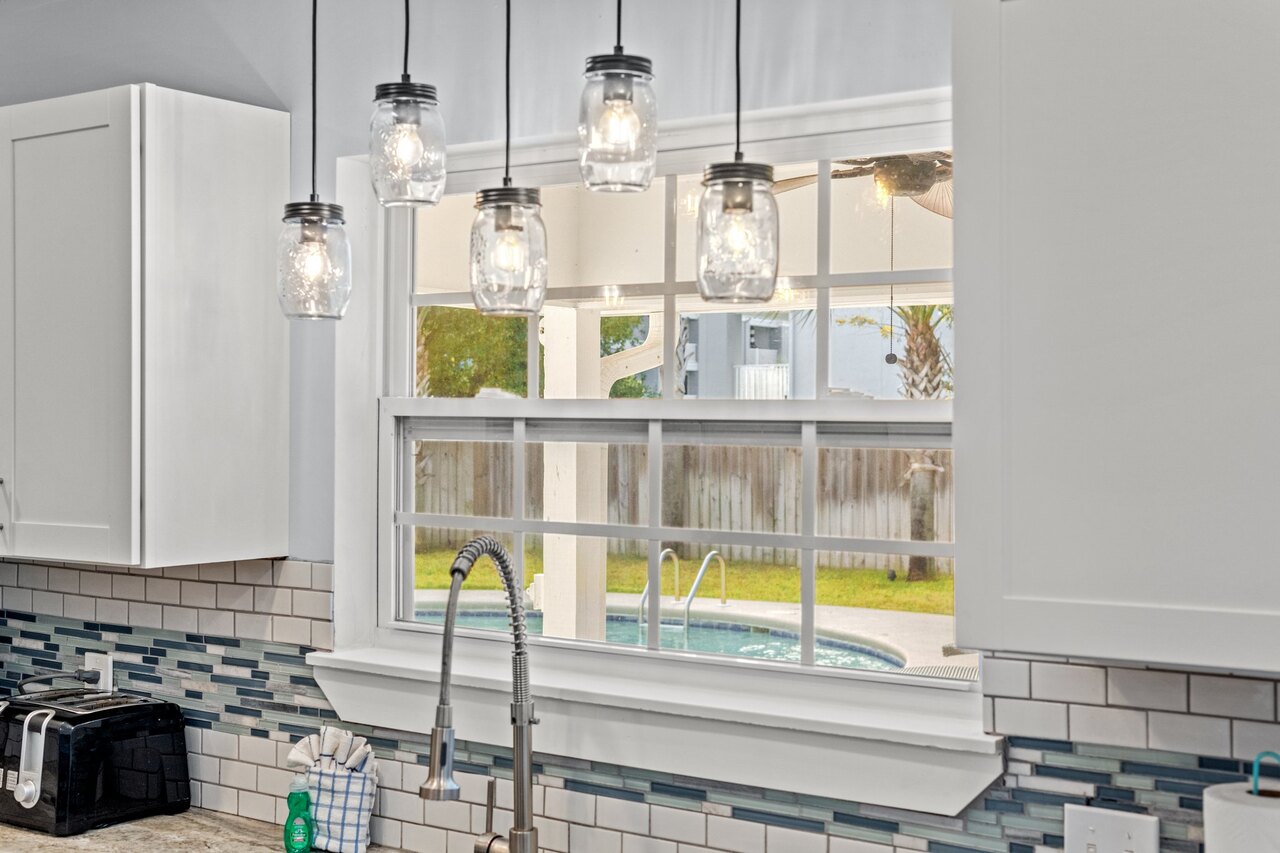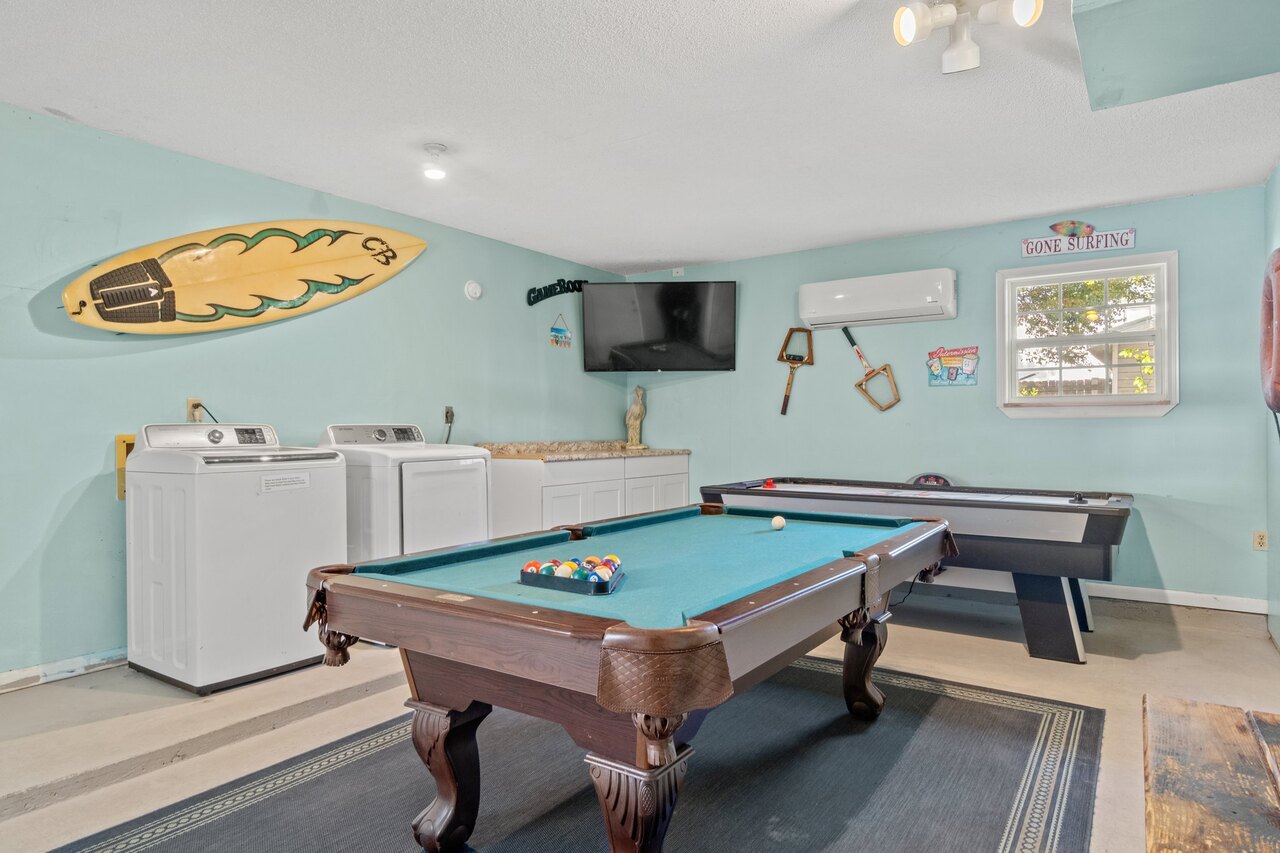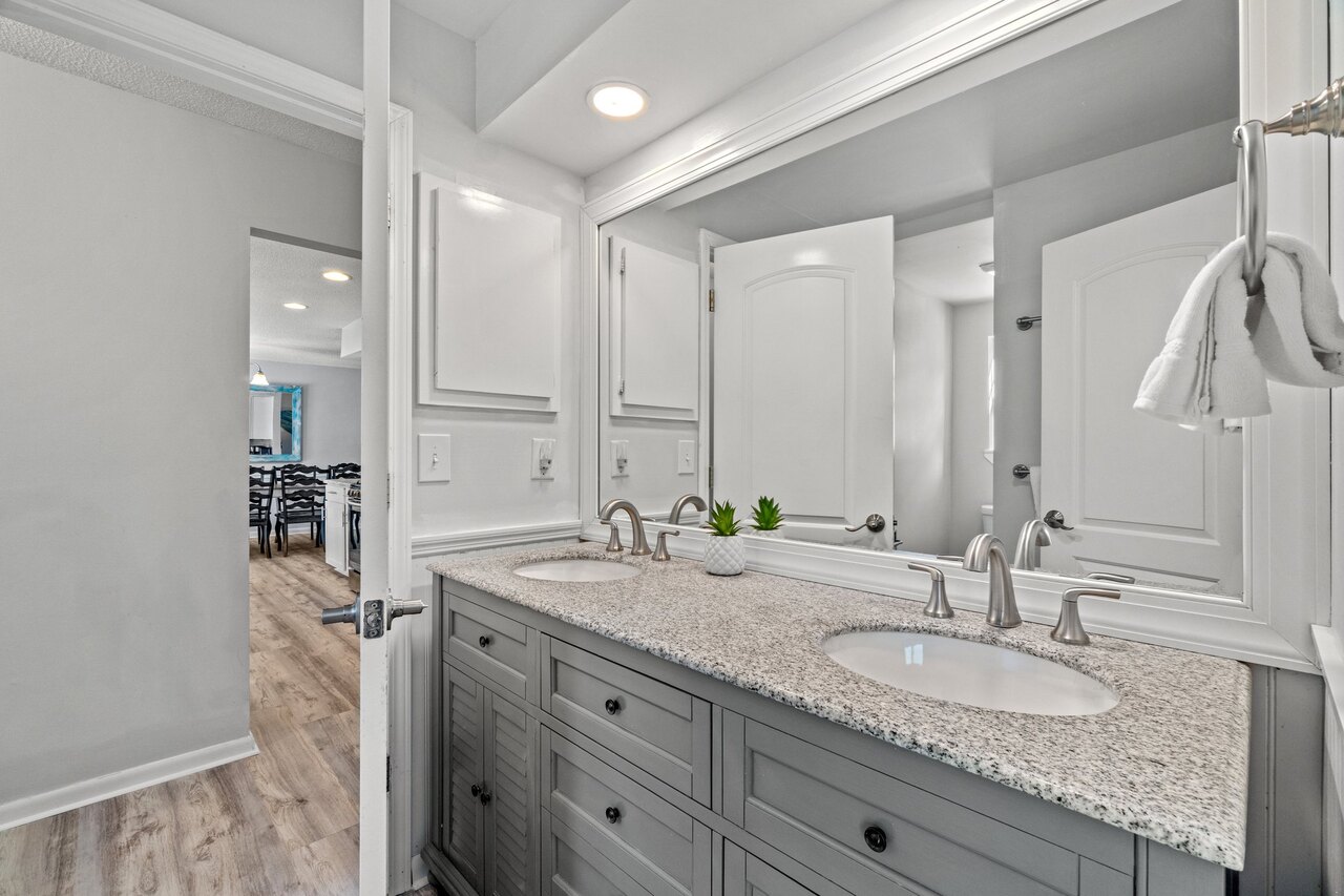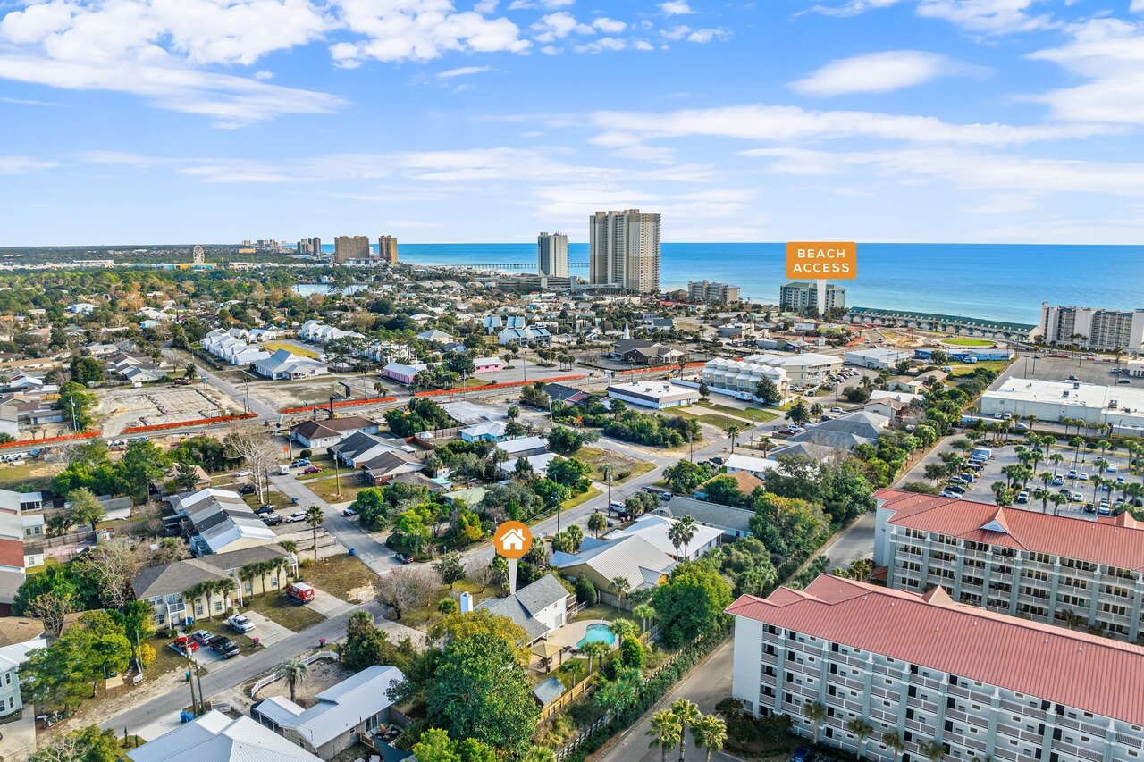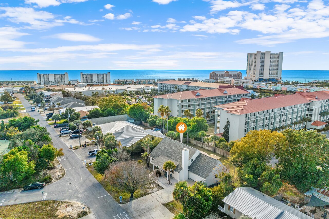 Welcome to the FLIP FLOP STOP! This large 4 bedroom home is located in the quiet west end of Panama City Beach and is dog friendly, you can have 2 dogs with a limit of 25 pounds each for a nonrefundable fee. Far from the hustle and bustle yet close to the beach and Pier Park. The perfect place for a family beach getaway! The owners have just completed a complete renovation with new paint, furnishings, and outdoor fire pit and much more. Carefree check in is easy. You’ll get an access code for the home so that you can go directly to the house without checking in at some office. Plus, there’s room for up to three vehicles. Let’s take a tour: Outside You’ll really enjoy the outdoors of Flip Flop Stop. From the heated private pool (which you can heat for a small extra charge) to the outdoor kitchen and bar and fire pit there’s plenty to enjoy here. And there’s room for rover to room too. And if you want to catch the latest game while you’re outdoors there’s a 55” SMART TV on the patio! But that’s just the beginning. For all you bikers, car enthusiasts, and fishermen, there’s enough parking space for your boat or your enclosed trailer. First Floor When you step in the downstairs area, you’ll see the large living room with 55” SMART TV mounted on the wall and the seating surrounding it so there’s plenty of room to relax and watch your favorite shows after a day at the beach. There’s also a queen sleeper for extra sleeping space. From there check out the large dining table with seating for 10. Family dinners every day! Next to that the large kitchen with new stainless appliances, granite counters and refreshed cabinetry. It’s ready for you to fix the family meals whenever you want. When the kids are done eating, they can head to the game room that’s equipped with both a pool table and an air hockey table. Let the games begin. The master suite downstairs has a king bed, large SMART TV and an ensuite bath with tub/shower combination. The second bedroom has a Queen bed. Second Floor Head upstairs where the second master has a king bed 46” SMART TV and a balcony for outdoor relaxing when you’re not around the pool or the firepit in the backyard. The loft bedroom has 3 queen beds and a 55” SMART TV. There’s a bath equipped with a tub/shower combination for everyone upstairs. Make sure you book your vacation early! FLIP FLOP STOP is booking up for spring break and summer. You must be at least 25 years of age to rent this property. During Spring Break , the minimum acceptable ratio is one (1) person 25 years of age for every two (2) persons under 25 years of age.