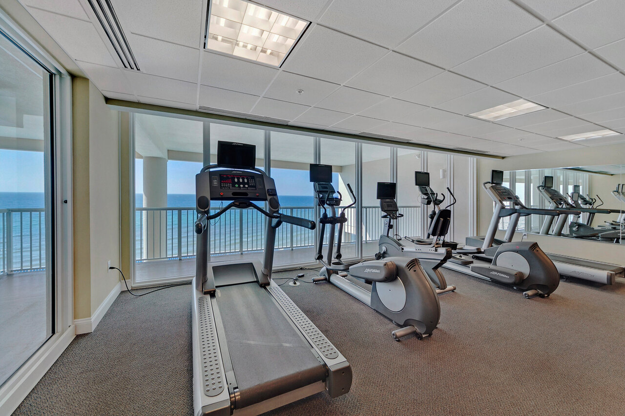 The Harbor at Palazzo - gorgeous 1 bedroom plus bunk room with 2 bath condo. Harbor- a place on the coast where vessels may find shelter, especially one protected from rough water. You are invited to The Harbor to enjoy a rejuvenating vacation! Sunrise and sunset beckons you to the large private balcony where you will enjoy breathtaking views of the Gulf of Mexico. Installed in 2020, this unit has a Guardian Air System in the condo that kills all airborne pathogens as they pass through the air handler! This luxurious, large one bedroom with separate bunk room (both with private baths) condo is situated on the highly desirable west end of Panama City Beach. The convenient location of Palazzo on the sought after west end is near HWY 79, the International Airport, lots of great restaurants, Pier Park & Santa Rosa Beach (30a). Palazzo offers an impressive array of Gulf front amenities such as: an elevated tropical gulf front pool and spa, fitness facility, meeting space and covered Gulf side parking. This condo has a large, fully equipped kitchen with granite countertops, washer/dryer and a very private balcony with endless Gulf front views. Palazzo is a new, quiet luxury building located just 1 mile west of 'Pier Park' in Panama City Beach. This condo sleeps 5 with a king bed in the bedroom with private bath, a separate bunk room (XL twins) with its own bathroom and a queen size sofa bed. The door in the hallway creates privacy for those sleeping on the sofa bed. The condo is fully furnished and has large, WiFi connected LCD televisions. The elevated pool/spa area is beautiful and provides fantastic gulf views, while you are lounging by the year round heated pool. A large fitness center with top of the line equipment also overlooks the pool and gulf. Parking is $40 per vehicle paid to the resort.