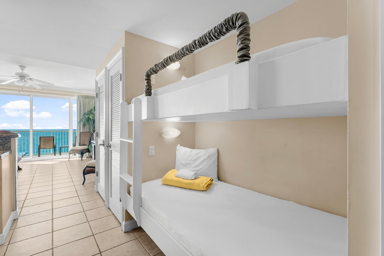 Welcome to Boardwalk 1806! We purchased this spacious Panama City Beach vacation rental condo a few years ago so that we could have a home at the beach that we could share with our family and others. We selected Unit 1806 because it is very spacious with incredible views of the beach. Our condo is a one bedroom one bath beach residence that sleeps up to 5 comfortably because all the rooms and the living area are quite large. One thing you’ll notice right away is that the balcony views of the world’s most beautiful beaches are spectacular. In the morning, we like to bring our binoculars along when we come so that we can enjoy our morning coffee while we watch the dolphins playing in the gulf. Since we spend time here ourselves, we’ve made this that this condo is decorated for maximum comfort. We wanted to create the feel of a home at the beach. For us and our guests. We hope you’ll have the opportunity to enjoy some of the unique features of this wonderful beach environment: Here are some more interesting features of our beach residence: -Carefree check-in so you can go right to this residence once you’re in town -Over 800 Square Feet of Living Space on the 18th floor -Large 150+ Square Feet of Balcony -The Living room comfortably seats 4 with Queen Sleeper Sofa -Living Room includes a 40+” Flatscreen TV -The kitchen bar seats 4 -Fully equipped Kitchen includes microwave, toaster oven, blender, coffeemaker,Flat Screen TV -Master Bedroom has a QUEEN bed and a Flatscreen TV -Master Bath has a combination tub/shower -The Kid-friendly bunk area offers twin bunks -There is wireless internet access throughout the residence -There is a stacked washer/dryer conveniently located in the unit We picked Boardwalk Beach Resort 1806 because it offers us quieter location that is still close to all the attractions Panama City Beach has to offer. We think you’ll agree that Boardwalk Beach Resort 1806 can be your beach home away from home, where you and your family to enjoy a truly memorable beach vacation. If you want to make sure your family has the beach vacation you all deserve, give our rental manager a call or an email as soon as you can. More about Boardwalk Beach Resort Boardwalk Beach Resort is a 22 Story condominium resort with a variety of very nice features in this condominium: -Security gated access -Convenient parking underneath the building -300+ feet of white sand private beach frontage with easy access -2500 sq. ft zero-entry heated pool with two hot tubs -Splash Zone (Kids pool area) -Sauna and steam room -Video arcade -Activity center and Kids’s Club -Beachside dining -Luggage carts for your convenience Boardwalk Beach Resort offers you everything you need for an unforgettable family vacation experience! .You must be at least 25 years of age to rent this property. During Spring Break , the minimum acceptable ratio is one (1) person 25 years of age for every two (2) persons under 25 years of age.
